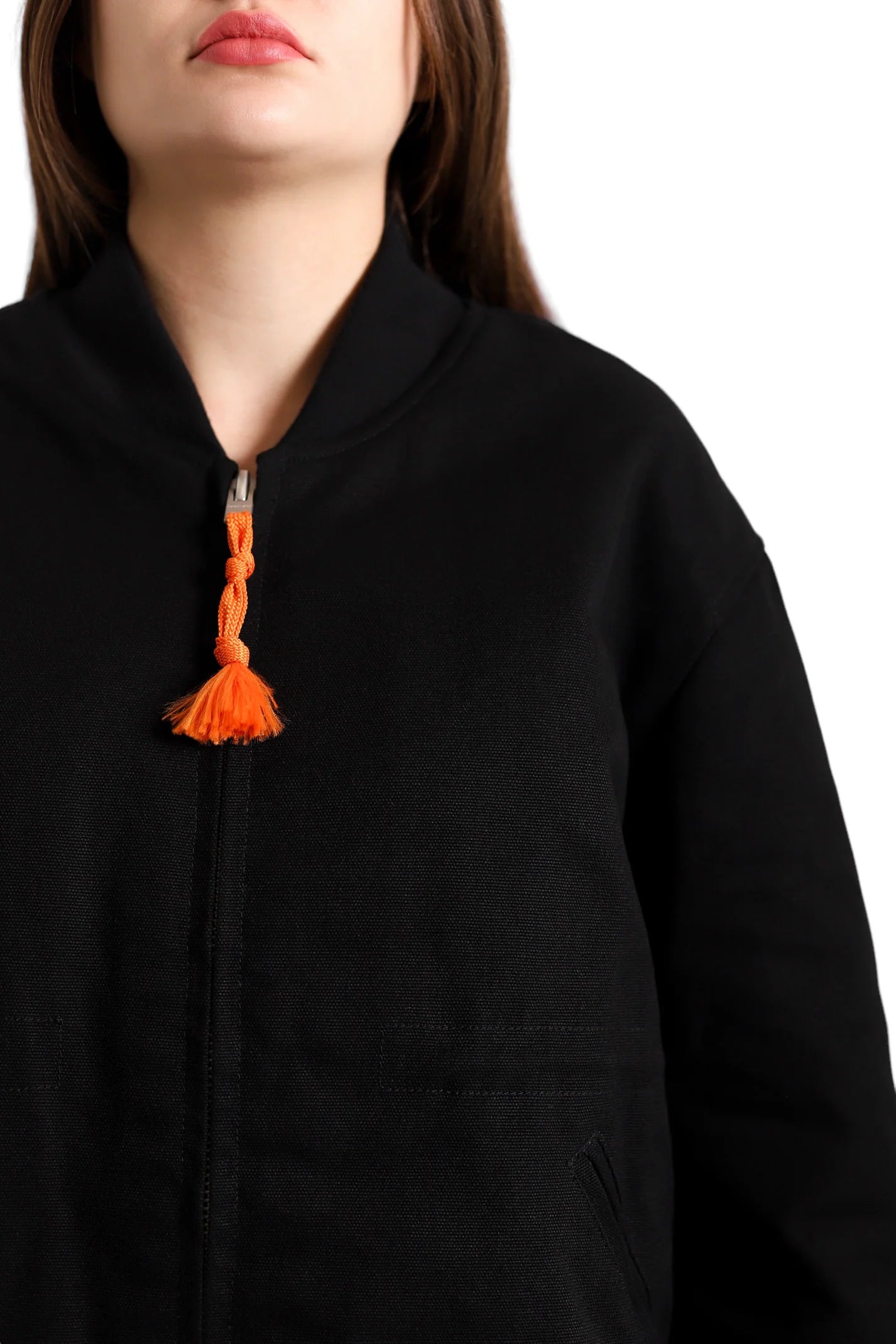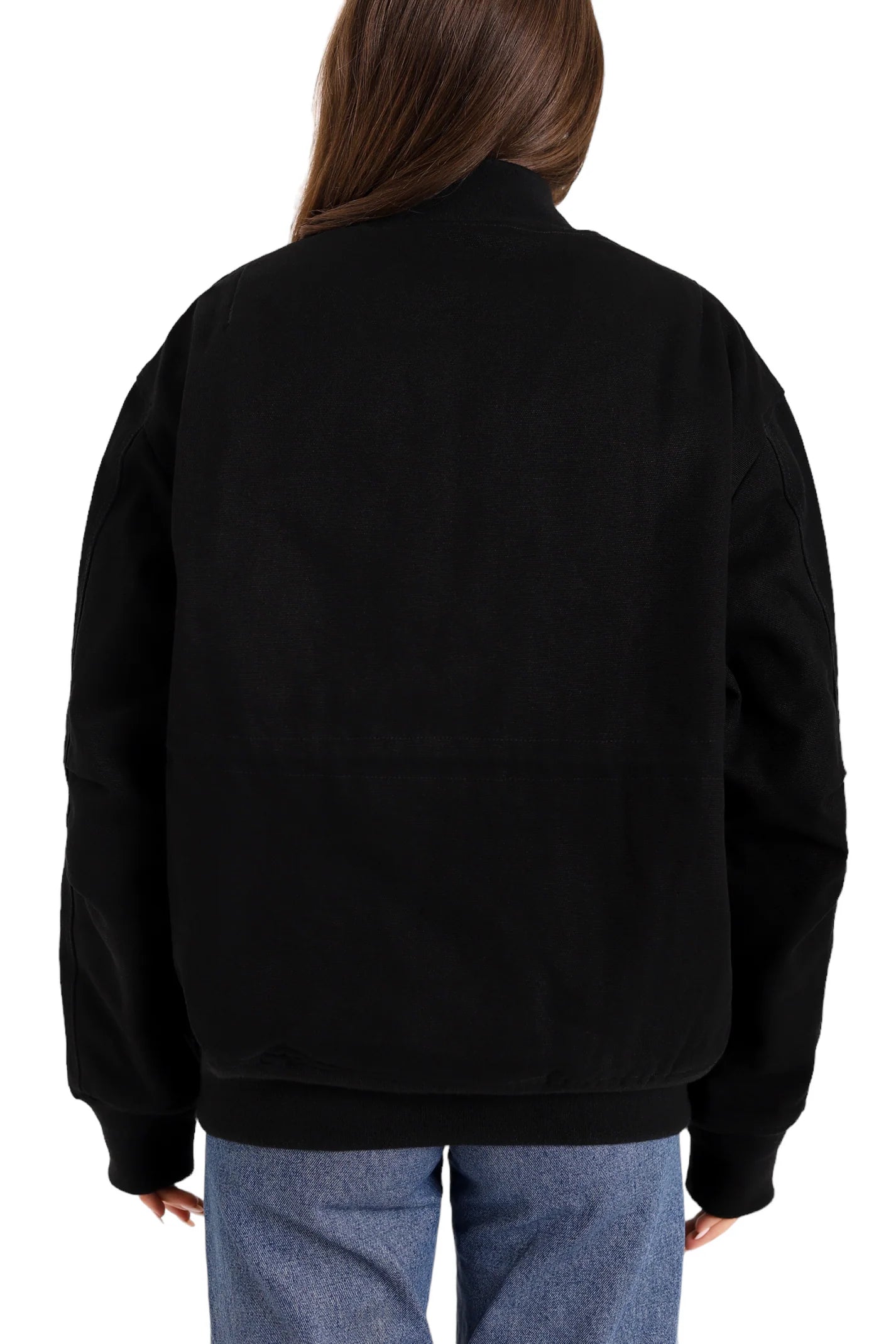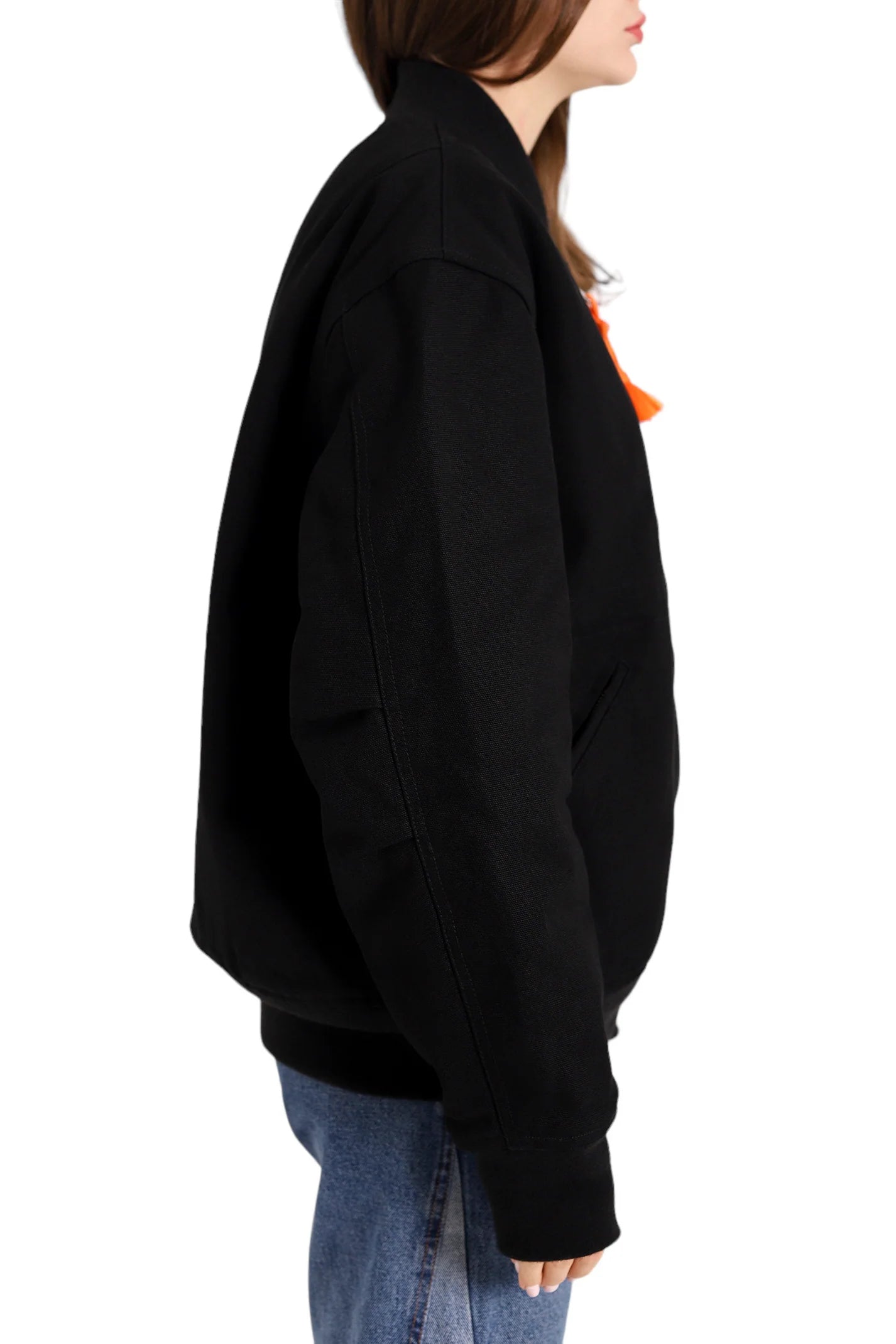 Ця модель бомбера від Acne Studios виходить за межі звичайної куртки, пропонуючи витончений і стильний вигляд. Виготовлена з високоякісної бавовняної тканини, вона поєднує в собі комфорт і елегантність. Легкий, приталений силует додає невимушеності, а застібка на блискавці робить її легкою у використанні. Дві бокові кишені на блискавці забезпечують зручність та функціональність, дозволяючи зберігати необхідні речі під рукою. Класичний чорний колір і знаковий мотив спереду роблять цей бомбер ідеальним доповненням базового гардеробу. Регульована талія і ребриста обробка додають елегантності та стильної завершеності, а шкіряний фірмовий патч стає виразною деталлю дизайну.