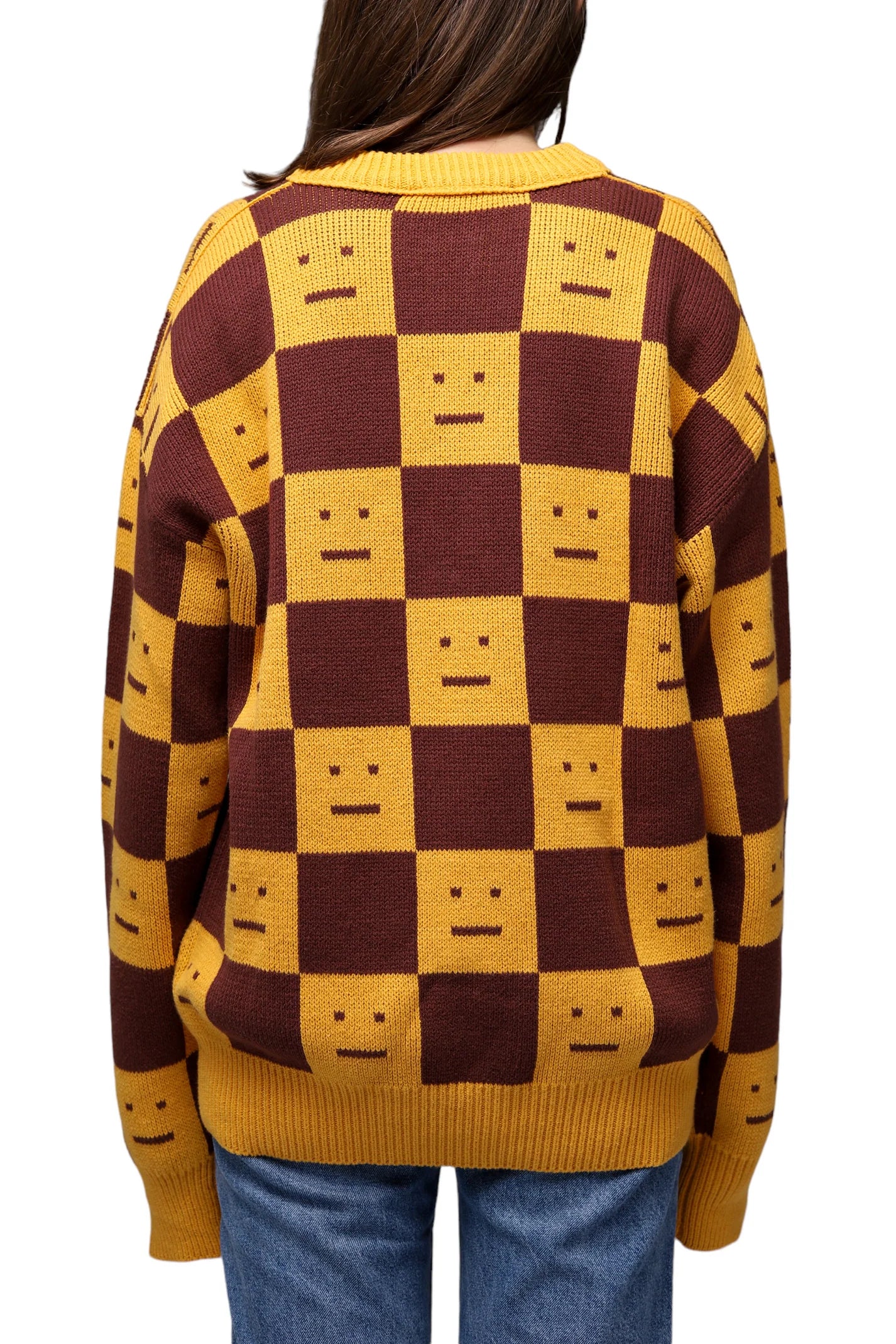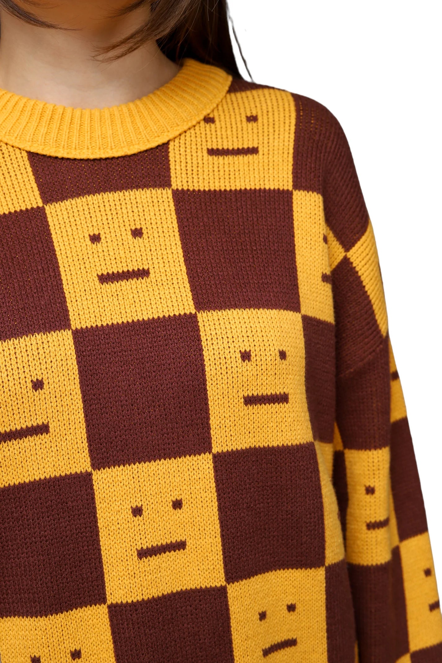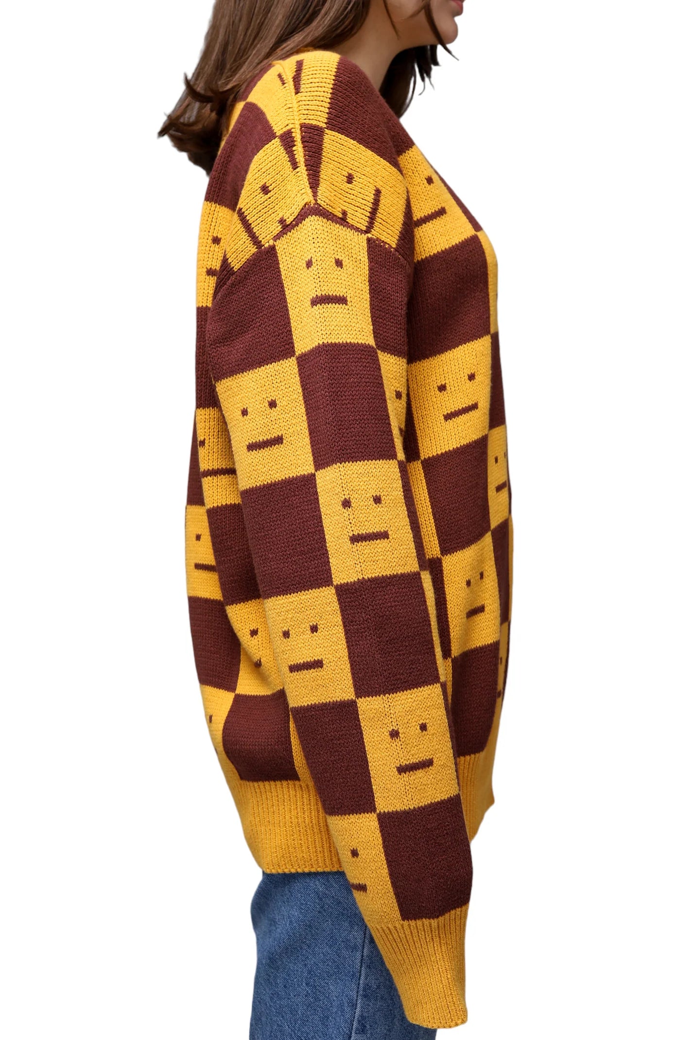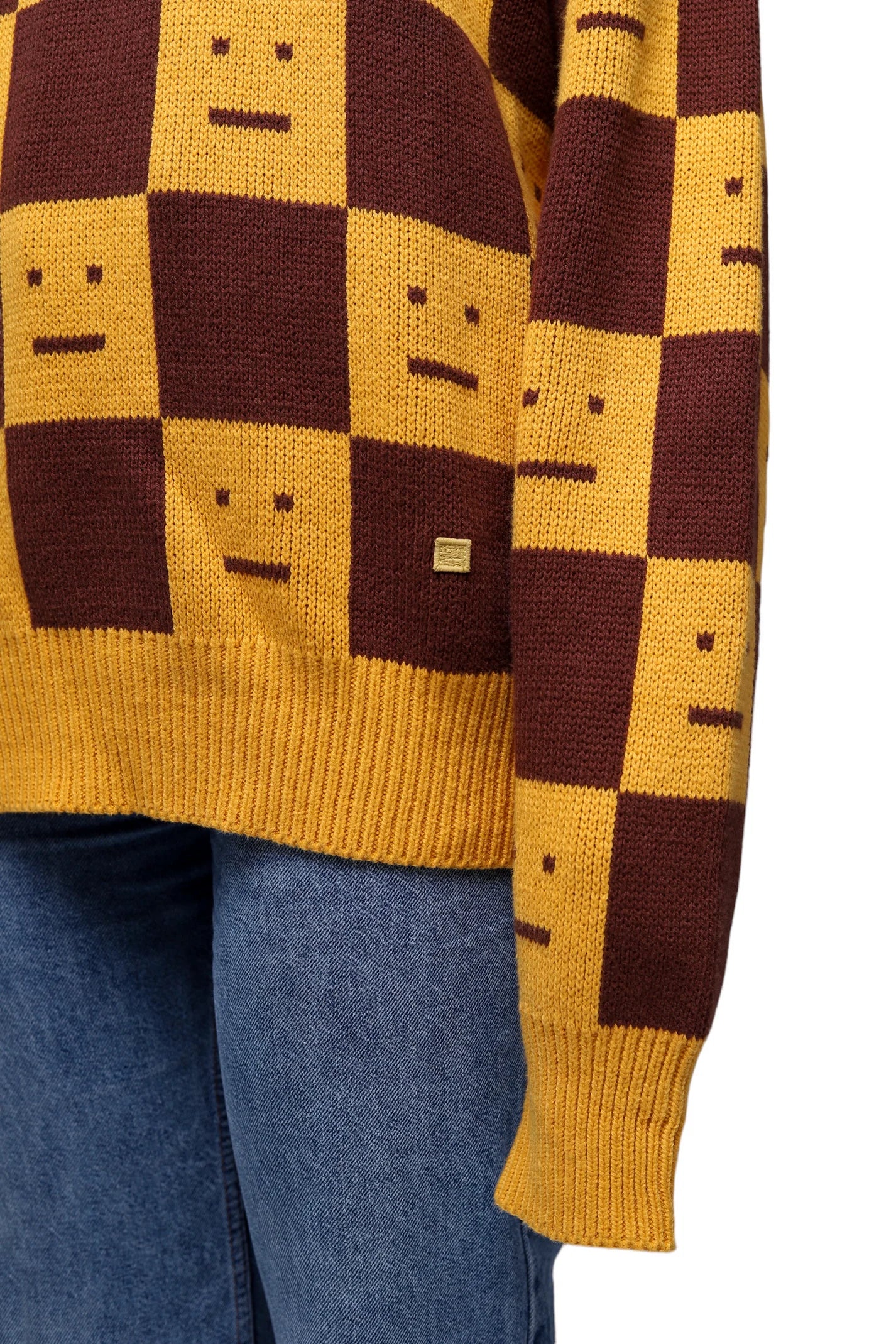 Виготовлений з вовни, цей светр обіцяє тепло та комфорт у холодну пору року. Його шаховий принт і різнокольорові ребристі вставки на горловині, манжетах і подолі додають цікавості та динаміки образу.