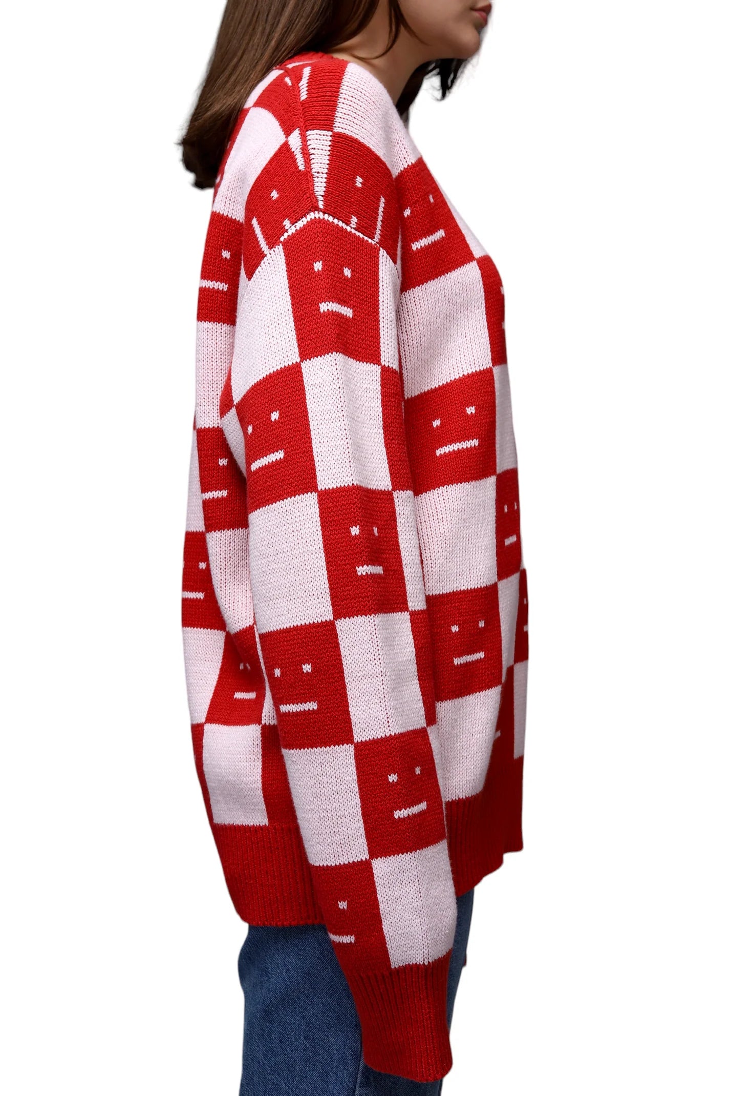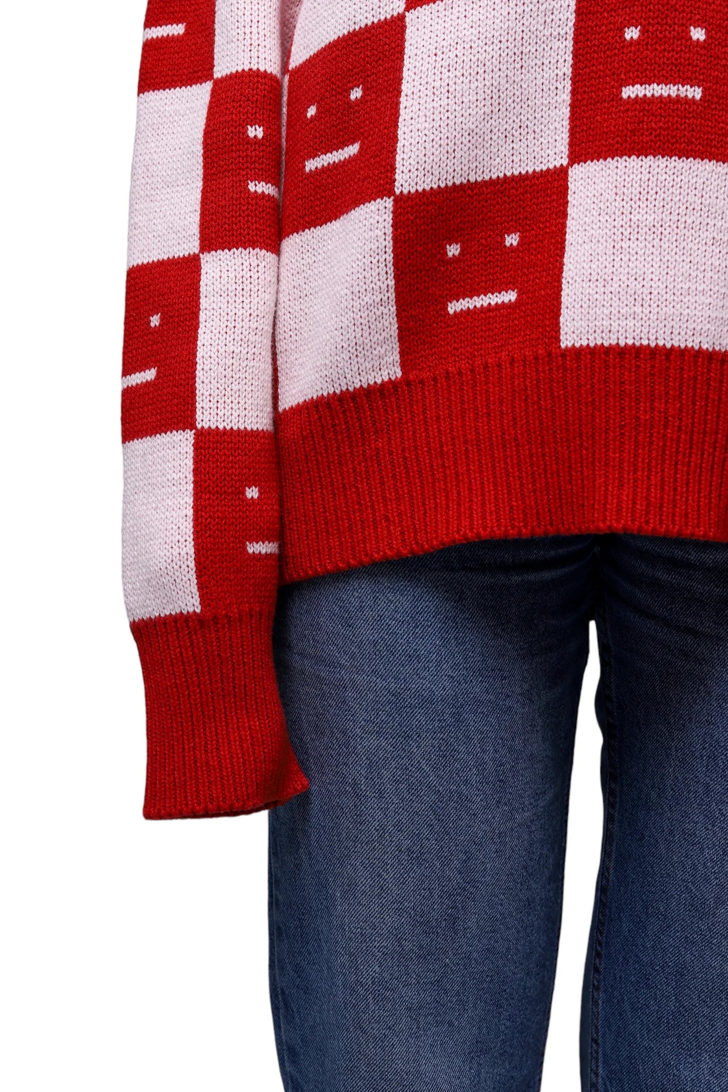Виготовлений з вовни, цей светр обіцяє тепло та комфорт у холодну пору року. Його шаховий принт і різнокольорові ребристі вставки на горловині, манжетах і подолі додають цікавості та динаміки образу.