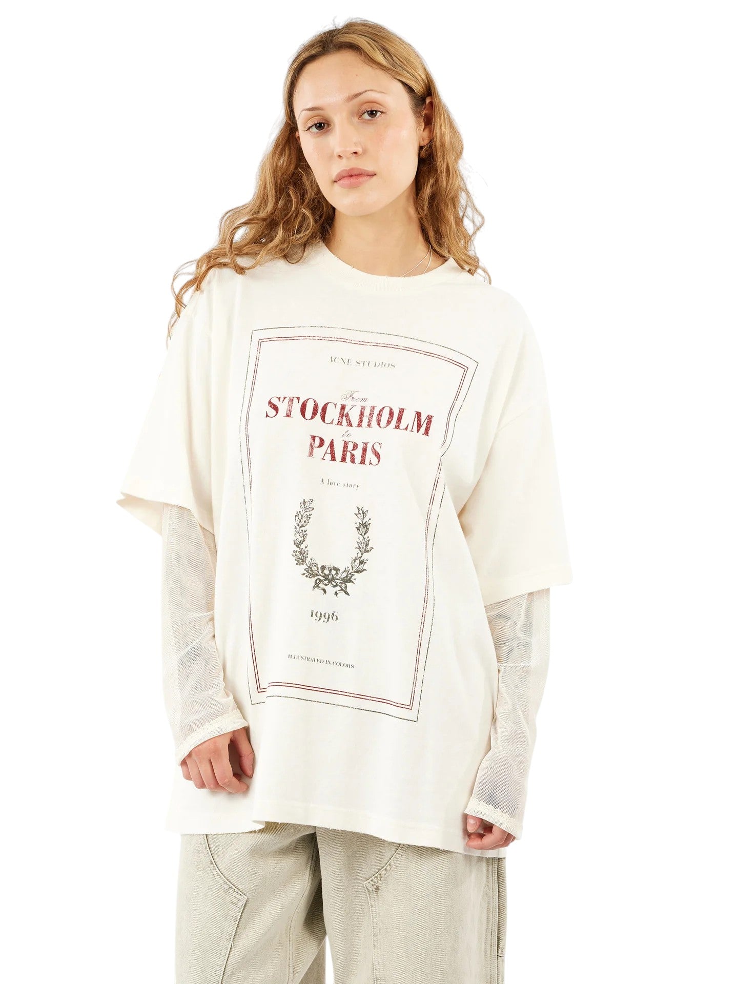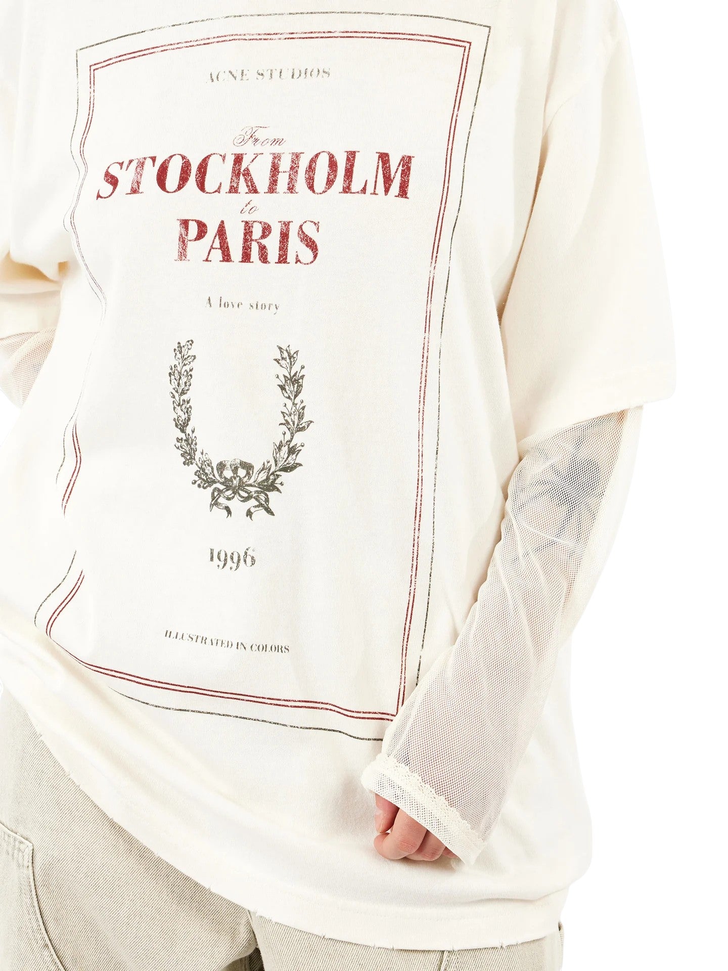 Acne Studios Layered Stockholm Paris Print T-Shirt Off White — стильна футболка з органічного бавовняного джерсі з прозорими сітчастими рукавами. Розслаблений силует, подовжена довжина та вінтажні потертості створюють невимушений образ, який доповнює графічний принт Stockholm Paris на грудях.