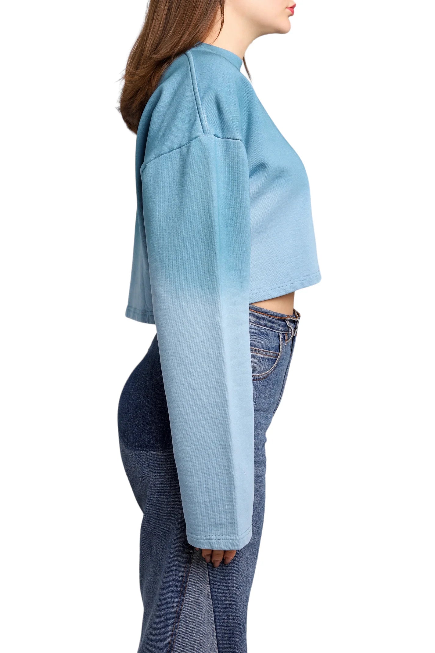 Укорочений світшот з довгими рукавами жовтого кольору вражає оригінальністю та стилем. З градієнтним візерунком, який напилено у синіх тонах, він привертає увагу своєю яскравістю та неординарністю. Трикотажний ребристий комір та укорочений поділ додають цій моделі сучасний акцент, підкреслюючи його унікальність. Логотип, надрукований жовтим кольором на задньому комірі, надає футболці завершеності. Виготовлений з органічно вирощеної бавовни, цей світшот є не лише стильним елементом гардеробу, але й демонстрацією вашої турботи про довкілля.