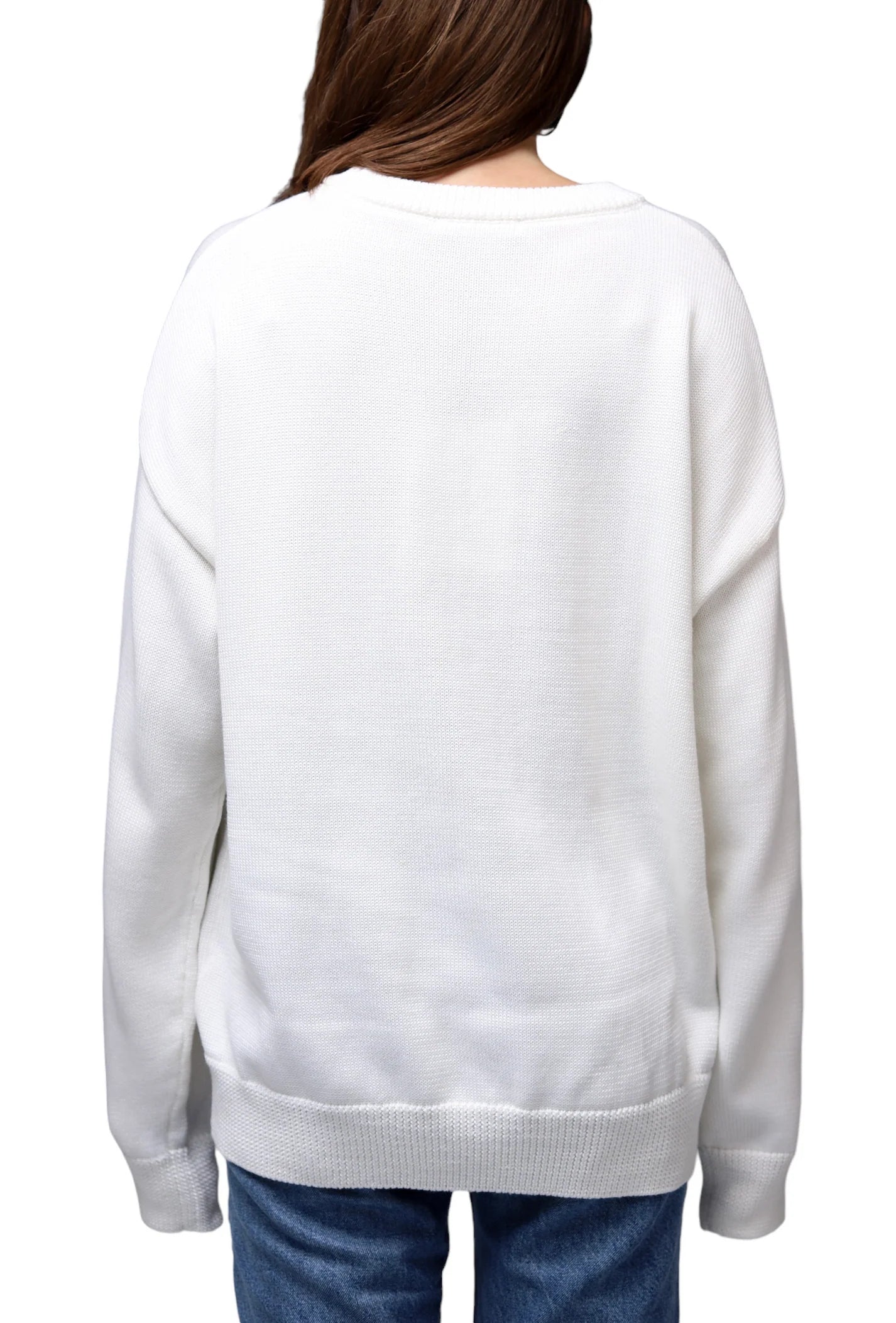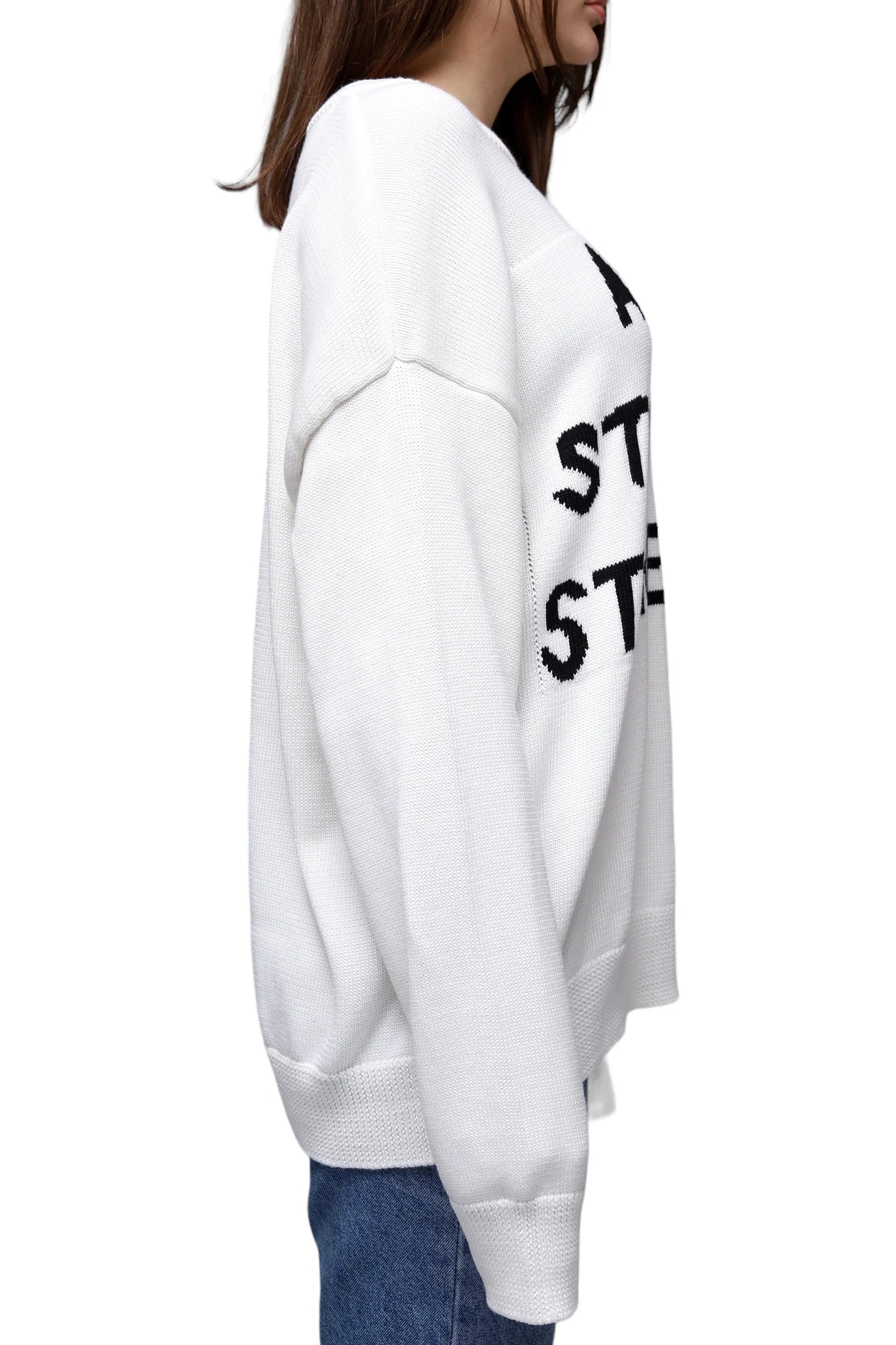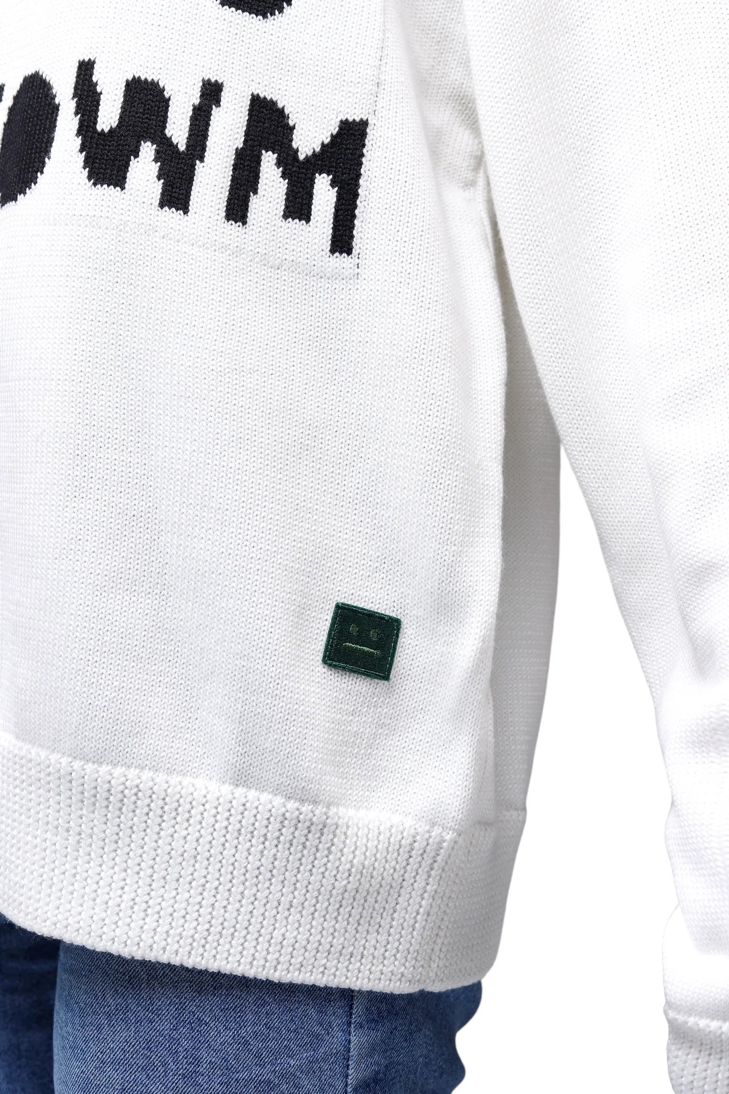 Цей трикотажний светр від Acne Studios з довгим рукавом виготовлений з м'якої вовни у білому кольорі. Він має ребристу в'язку на комірі, манжетах і низі, що додає йому структуру і стиль. Цікавий додаток - в'язаний текст на грудях та вишита аплікація логотипу в зелених тонах на талії, які роблять цей светр особливим і виразним.