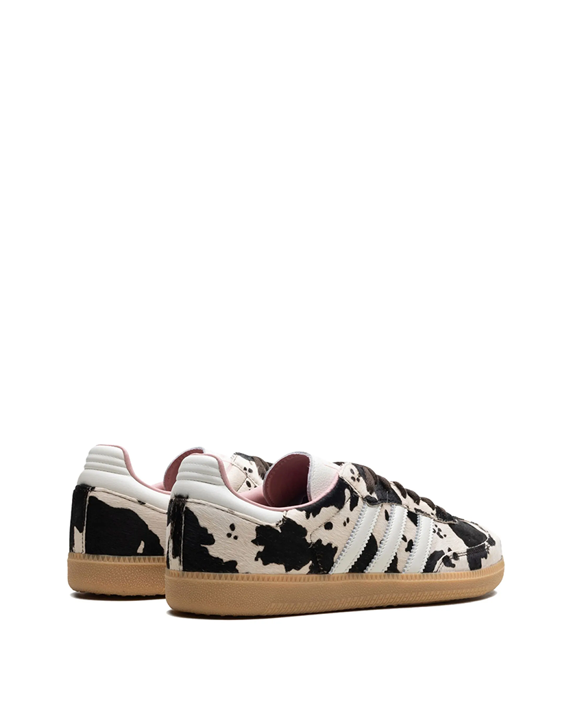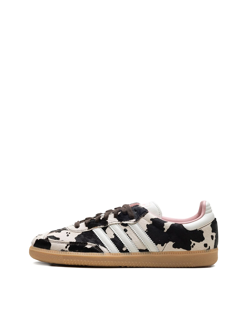 Adidas Samba OG Cow Print — стильне переосмислення культової моделі, що вирізняється верхом із натуральної шкіри з унікальним принтом у вигляді коров’ячої шкіри в темно-коричневих та кремово-білих відтінках. М’яка шкіра та зручна устілка забезпечують преміальний комфорт і підтримку протягом дня, а фірмові зубчасті три смужки та Т-подібне накладення на носку зберігають впізнавану естетику класичних Samba. Завершує дизайн легендарна гумова підошва Gum 3, яка дарує надійне зчеплення, довговічність і характерний ретро-шарм.