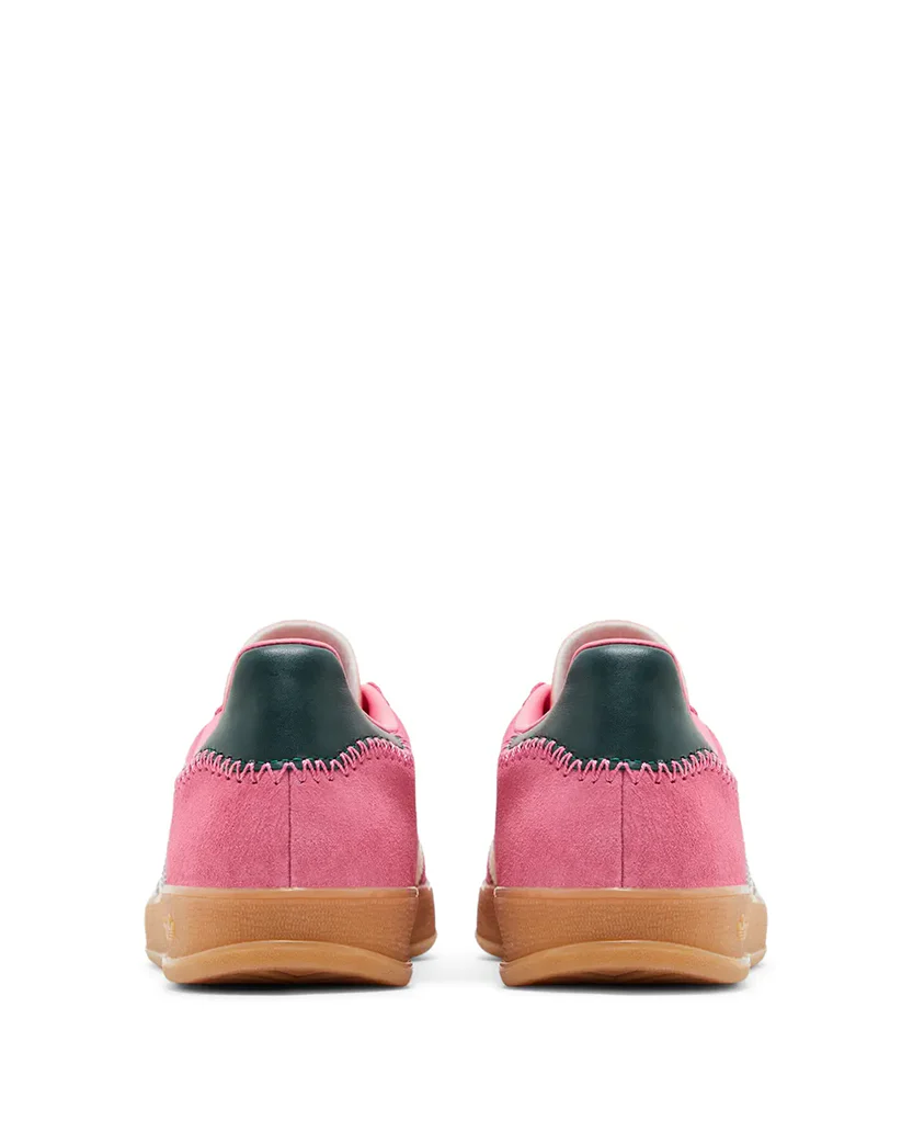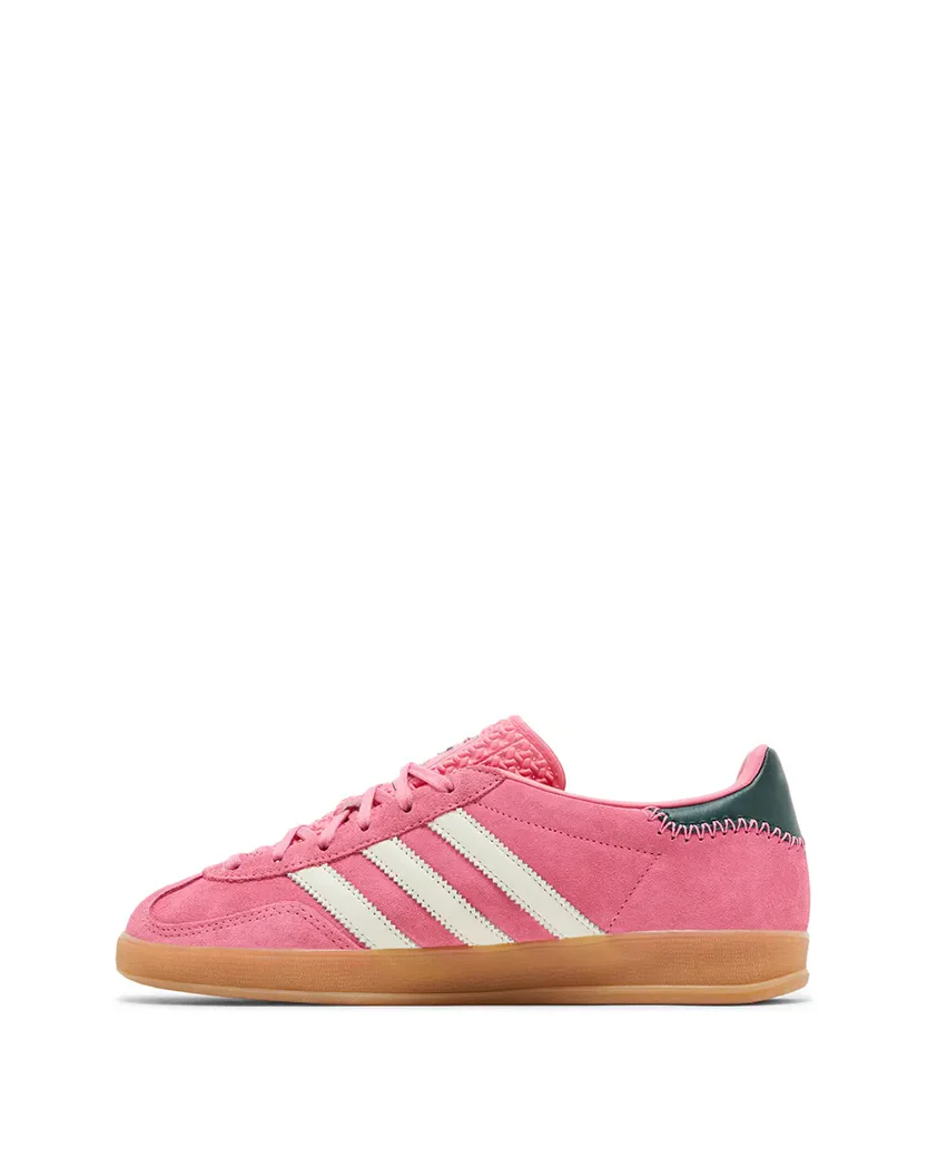 Розкішні кольори поєднуються з історичним стилем у цих ексклюзивних кросівках Adidas Wmns Gazelle Indoor 'Rose Tone Collegiate Green'. Цей вигадливий колір представлений у яскраво-рожевому замшевому верху з темно-зеленими шкіряними вставками на п'ятах, подібними до колаборації з Gucci. Білосніжні шкіряні 3-смужки розташовані на чвертьпанелях, доповнюючи золотистий логотип «Gazelle» на зовнішній боковині. Рожева прострочка ззаду та язичок з матеріалу Ecotex додають глибини дизайну улюблених терасових кросівок, а класичний логотип adidas у вигляді трилисника відсилає до спортивної спадщини бренду. Устілка Ortholite забезпечує амортизацію, а гумова підошва підкреслює позачасовий стиль.