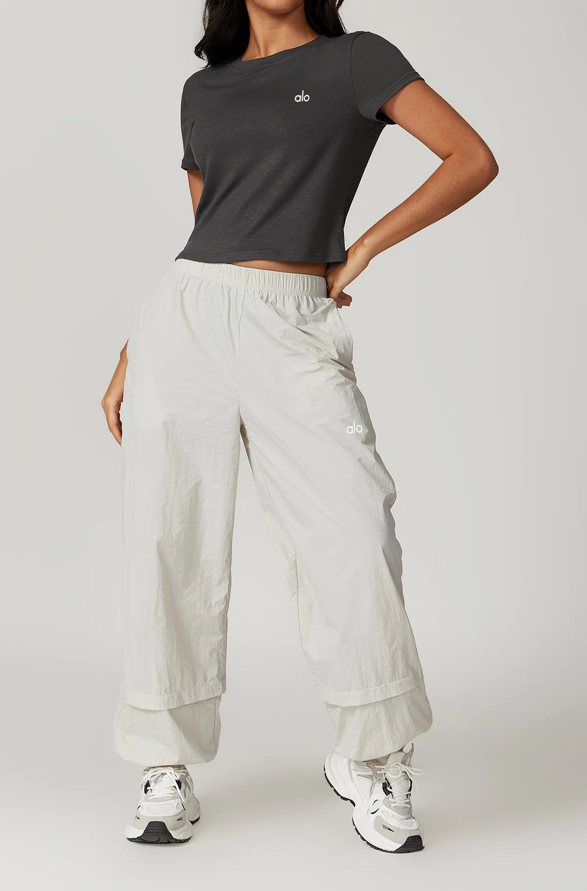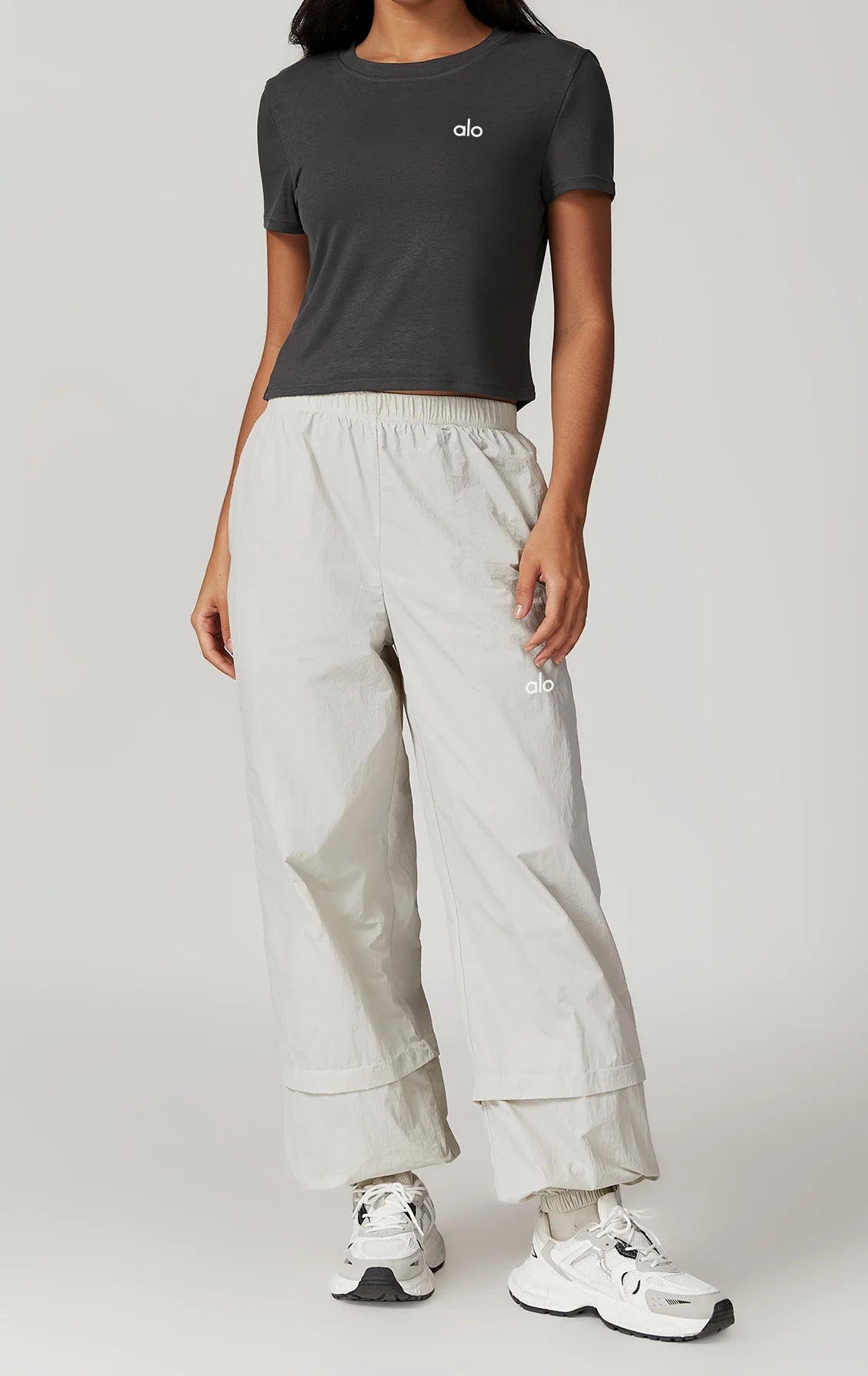 Alo Yoga Crop Slim Tee — це модна укорочена футболка з м’якої, еластичної тканини, яка забезпечує комфорт і підкреслює фігуру завдяки облягаючому крою та сучасному дизайну.