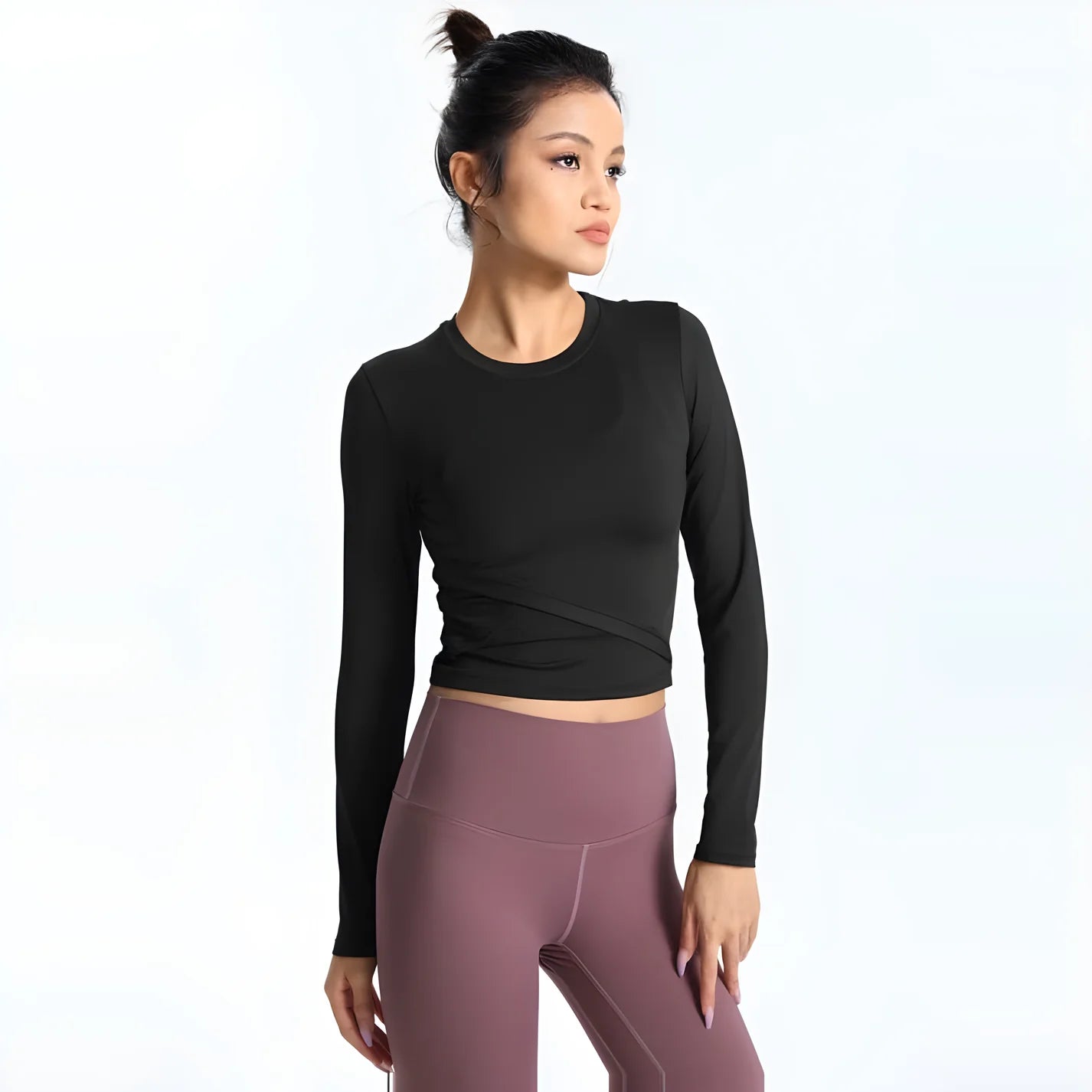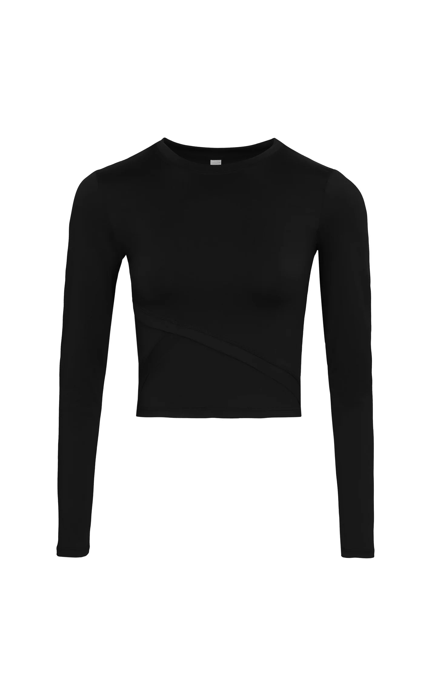 Цей топ стане незамінним як для повсякденних прогулянок, так і для спокійних занять йогою. Його м’яка, майже шовковиста тканина ніжно облягає тіло, доповнюючи образ круглим вирізом, укороченим краєм і чарівними боковими рюшами. Оберіть свій улюблений колір і поєднуйте з легінсами чи широкими штанами.