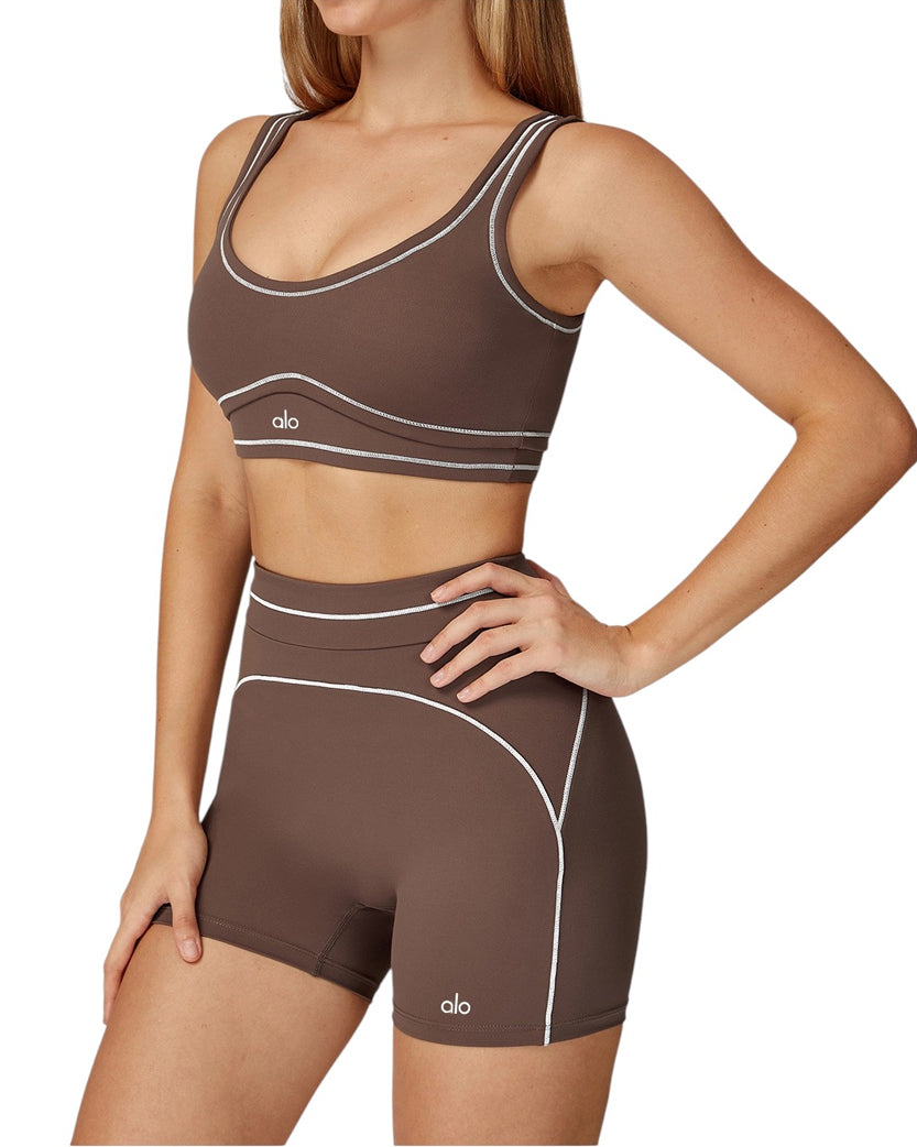 Alo Yoga Pulse Bra — спортивний топ із фірмового матеріалу Airbrush, який м’яко облягає тіло, забезпечуючи комфортну компресію та підтримку. Контрастні білі шви додають виразності та підкреслюють форму. Вигнутий виріз створює жіночний силует, а еластична тканина забезпечує свободу рухів. Ідеальний вибір для йоги, пілатесу або активного дня.