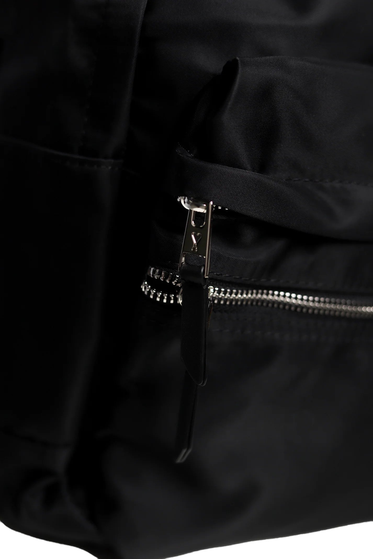 Цей чорний рюкзак від Ami Alexandre Mattiussi поєднує стиль і функціональність. Виготовлений з технічного матеріалу з шкіряними вставками, він має сучасний і елегантний вигляд. Рюкзак оснащений двосторонньою блискавкою для легкого доступу до речей. Спереду він прикрашений червоним логотипом "Ami de Coeur", що додає оригінальності. Також у нього є дві передні кишені на блискавці, одна кишеня ззаду та верхня ручка для зручного носіння в руці. Регульовані плечові ремені забезпечують комфортне носіння на плечах. Металеві деталі сріблястого кольору додають стильного акценту до дизайну рюкзака. Внутрішнє відділення містить кишеню для дрібниць, що робить виріб більш організованим і зручним.