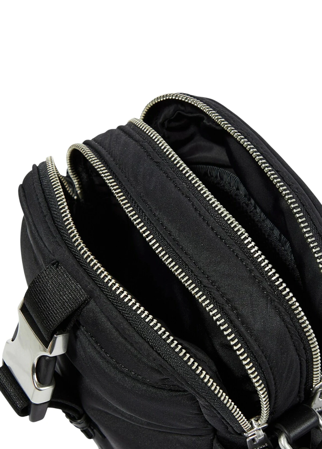 Сумка AMI Paris виконана з м’якого нейлону з акцентом на гладкі шкіряні деталі, що додають їй вишуканого вигляду. Завдяки продуманій конструкції з двома верхніми відділеннями на блискавці, передньою кишенею з пряжкою та двома бічними кишенями зі шнурками, модель відзначається функціональністю й зручністю. На звороті розміщена шкіряна кишеня з тисненим логотипом бренду, а регульований ремінь через плече дозволяє адаптувати сумку під індивідуальний стиль носіння.