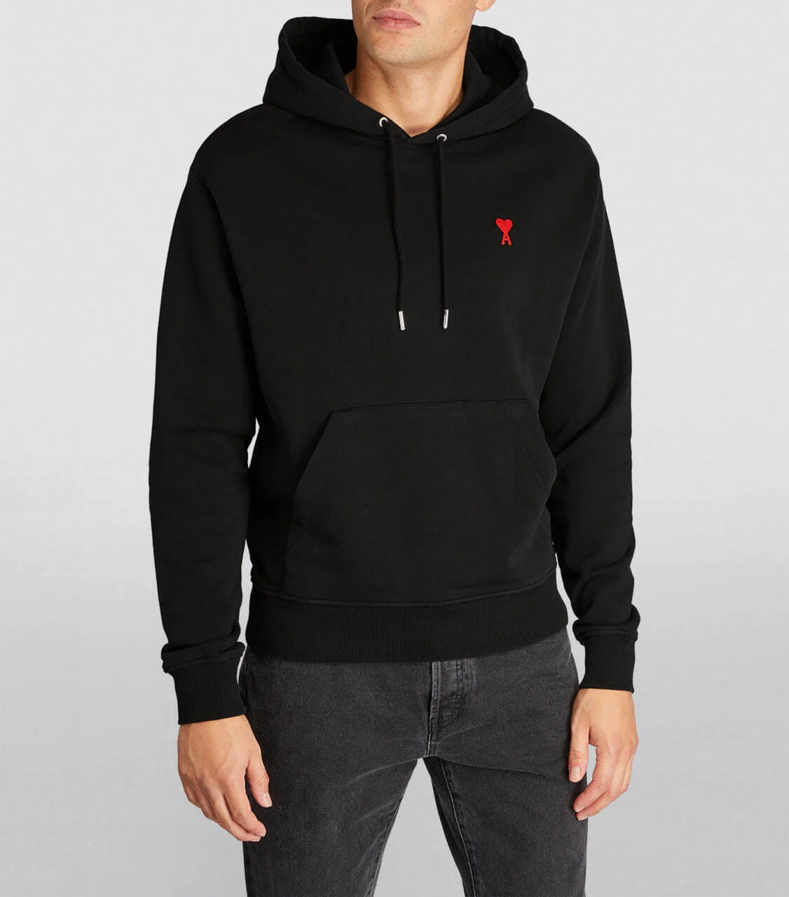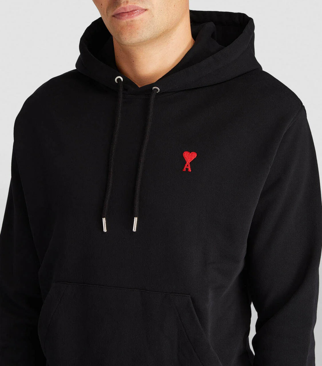 Худі від бренду AMI Paris оснащене регульованим капюшоном, довгими рукавами і має вишитий на грудях знайомий логотип у вигляді маленького червоного серця.
