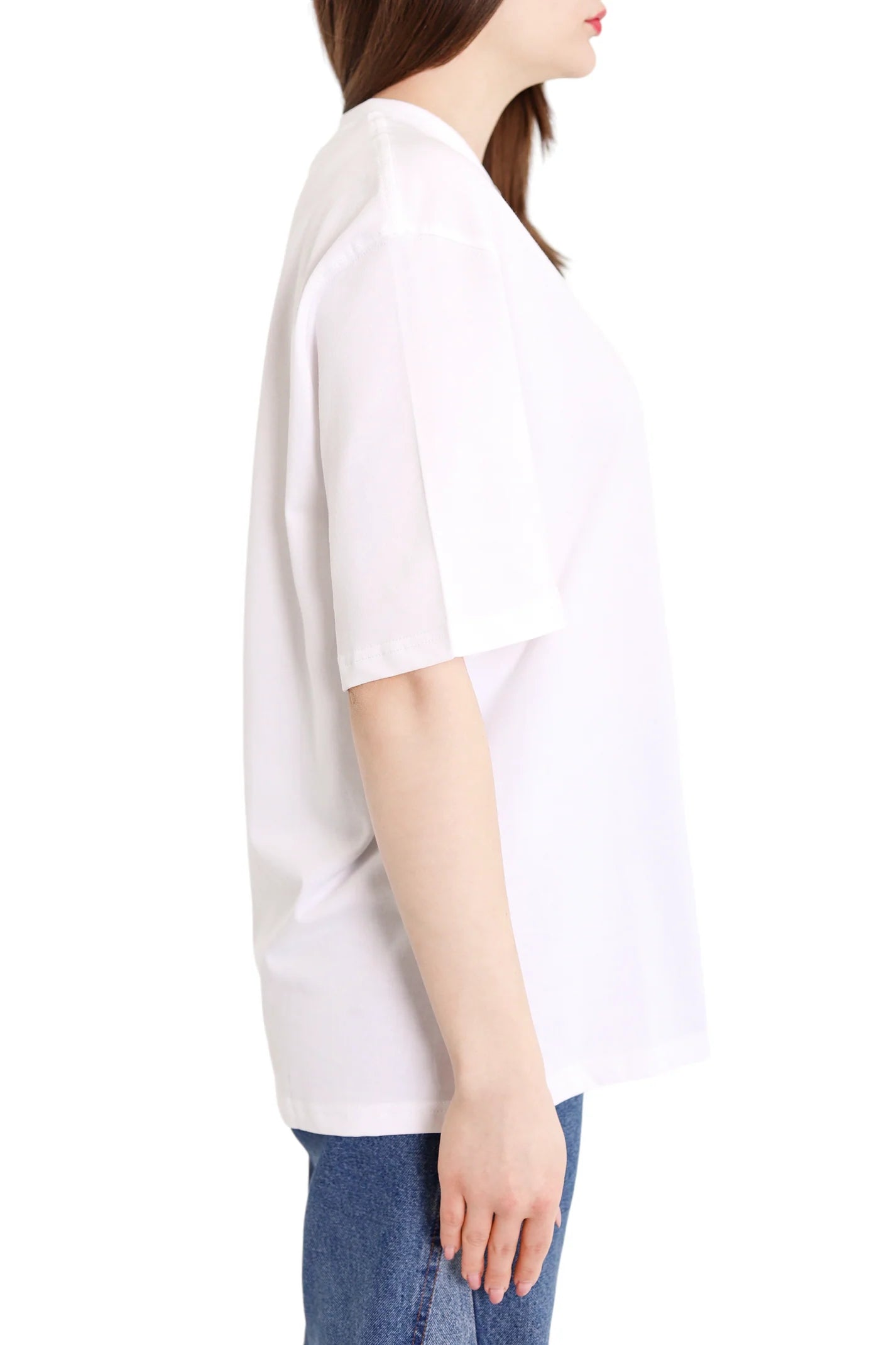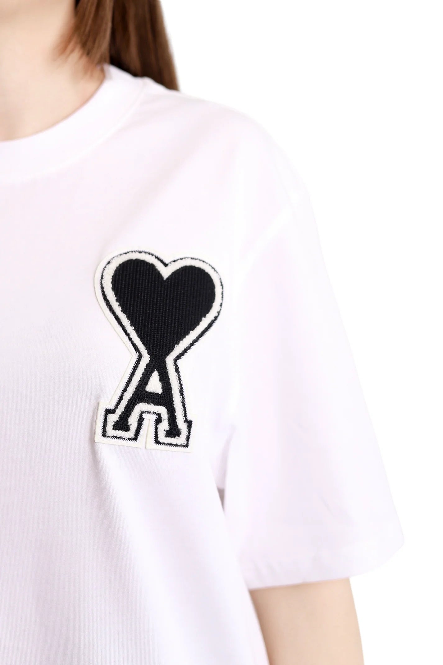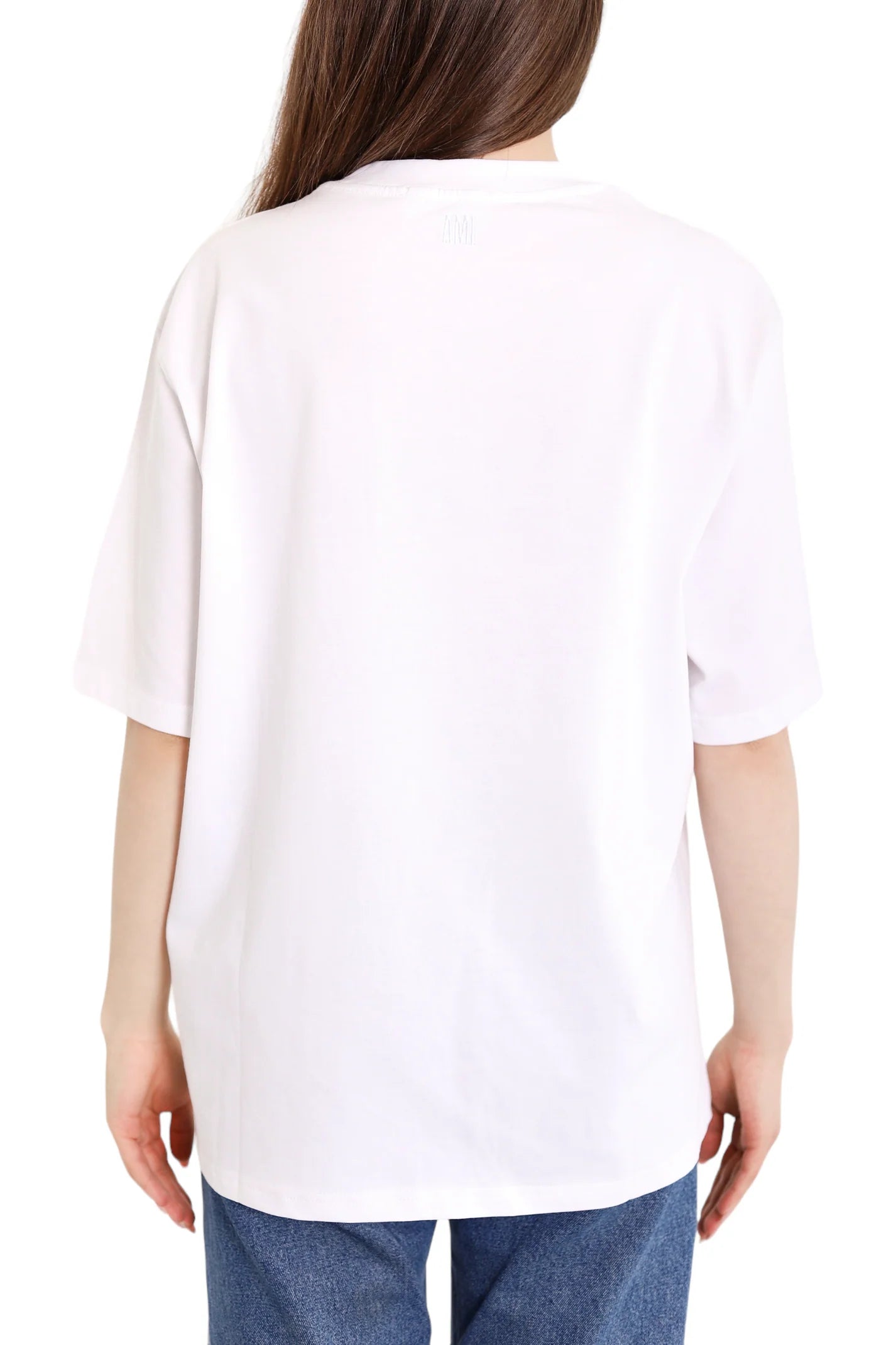 Оверсайз футболка від AMI Paris виготовлена зі 100% органічного бавовняного трикотажу. Вона має короткі рукави, вільний крій та спущені плечі, що забезпечують максимальний комфорт. Ребристий виріз горловини додає стильності. На грудях розміщена аплікація з логотипом бренду, а на задньому комірі вишитий логотип у тон, що робить футболку виразною та стильною
