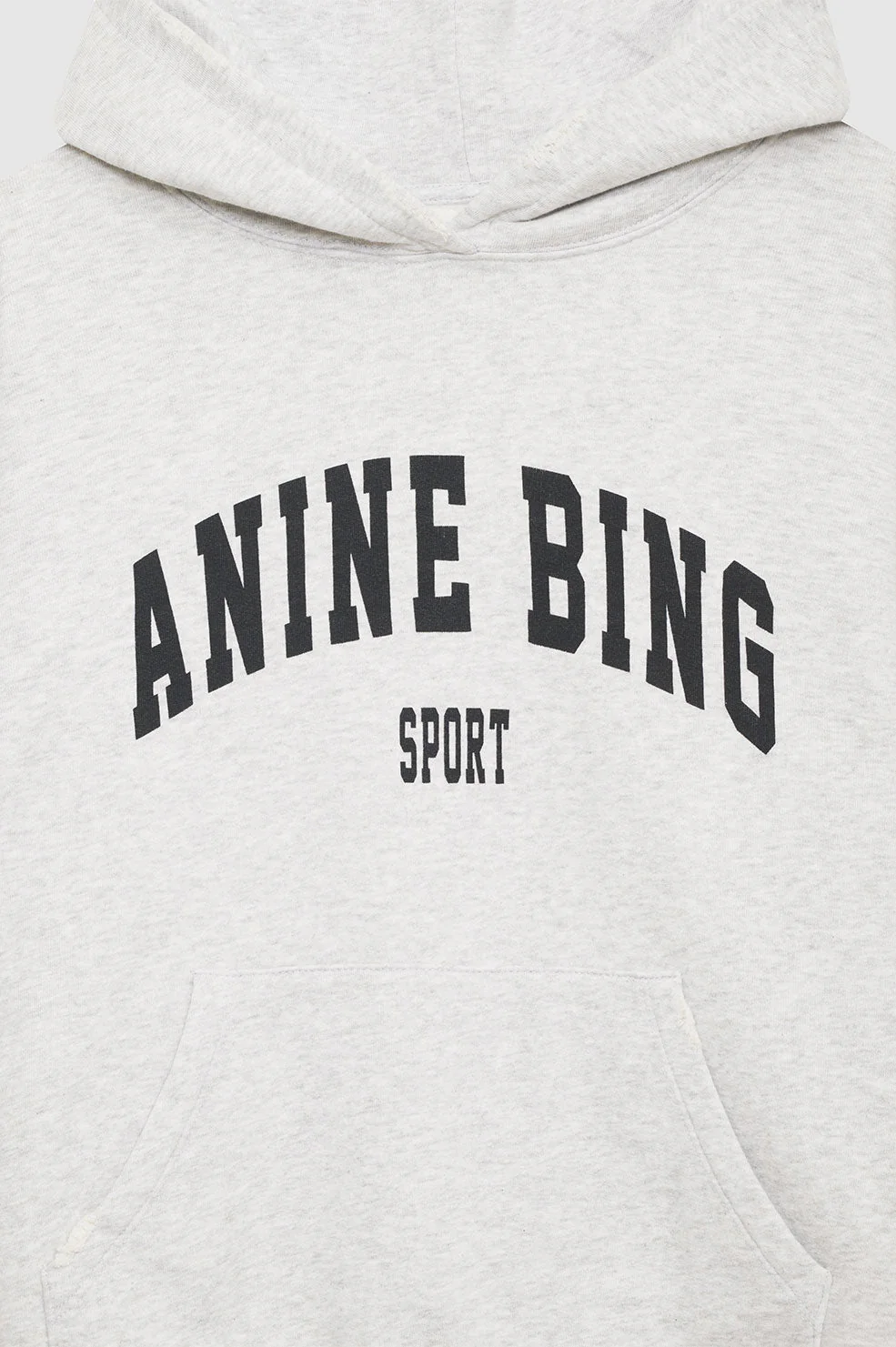 Anine Bing Harvey Hoodie — це об'ємне худі з капюшоном, виготовлене з 100% бавовняного флісу середньої ваги в стильному сірому кольорі. На грудях розташований автентичний графічний напис ANINE BING Sport, а ребриста обробка з ефектом потертості по краях манжетів рукавів, і поясу надає виробу вінтажного вигляду. Функціональна передня кишеня-кенгуру доповнює його зручність, роблячи це худі ідеальним вибором для комфортного повсякденного носіння.
