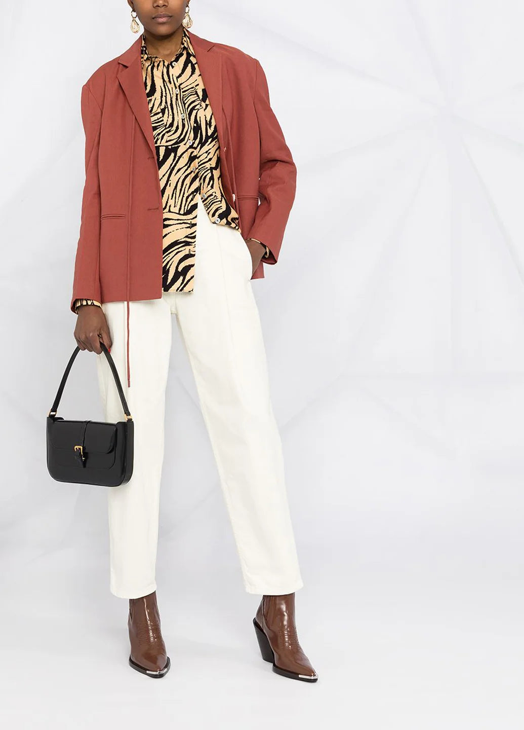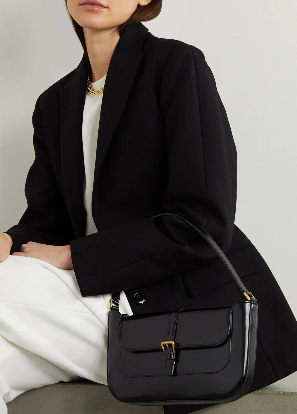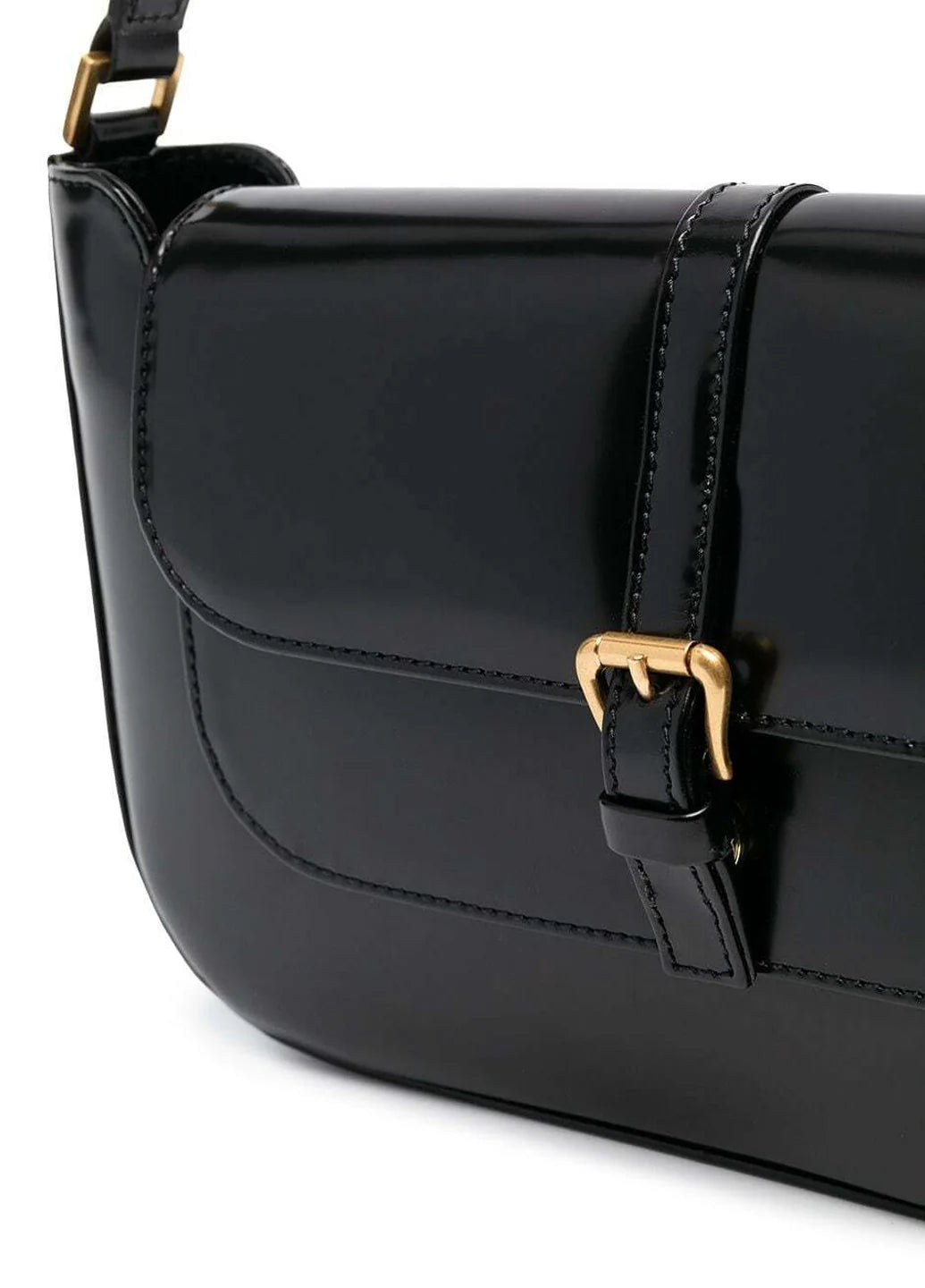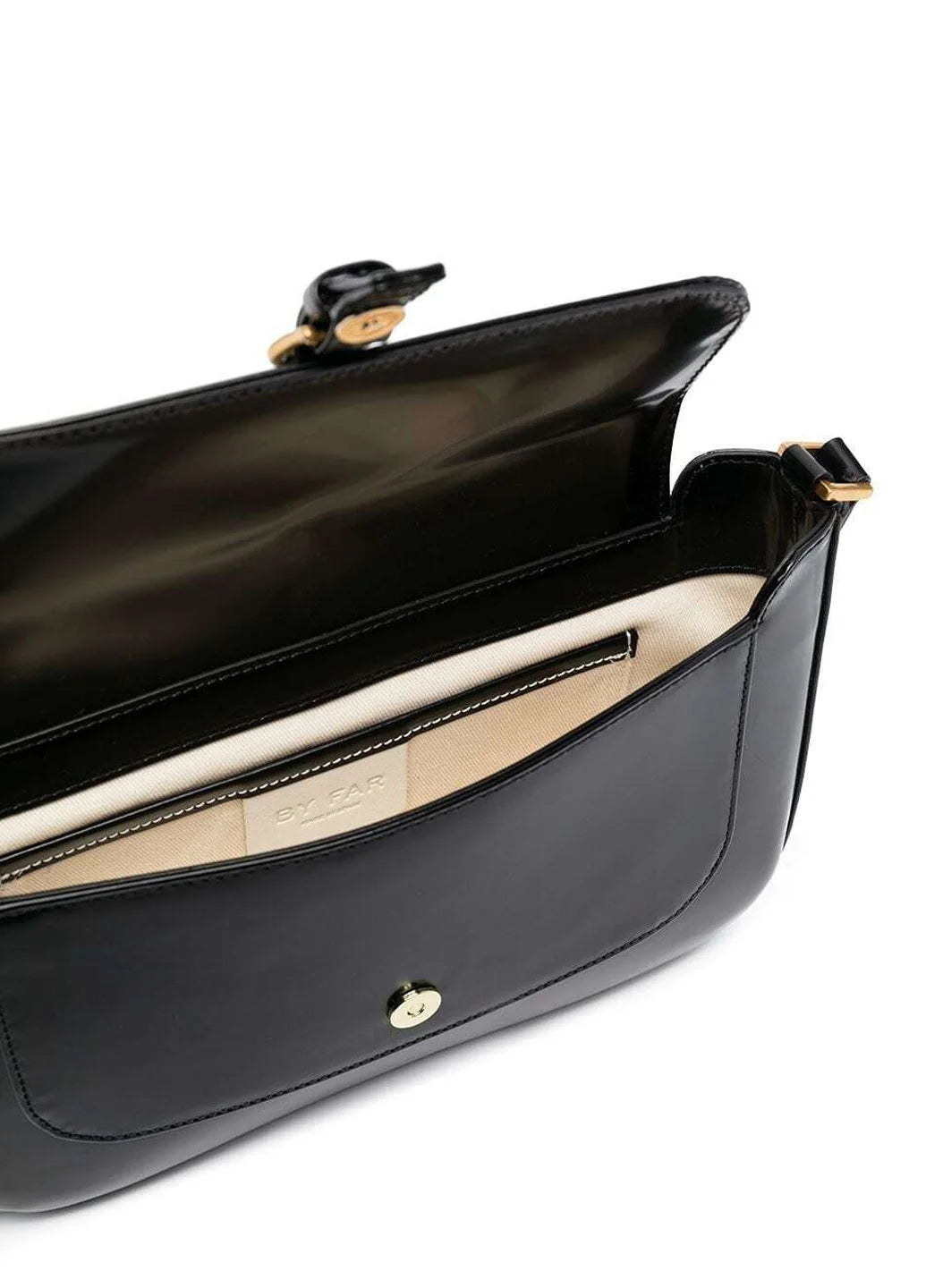 BY FAR надає унікального підходу класичному силуету сумки-багет завдяки структурованому дизайну. Напівшкіряний матеріал з легким блиском, характерний для бренду, додає виробу елегантності та розкоші. Фурнітура зі золотим покриттям з матеріалу Zamack підкреслює стильний вигляд сумки. Магнітна застібка-кнопка забезпечує зручність у використанні, а внутрішня кишеня допомагає організувати речі всередині. Завершують образ фарбовані краї та підкладка зі 100% бавовни, роблячи цю сумку не тільки модним, але й практичним аксесуаром.