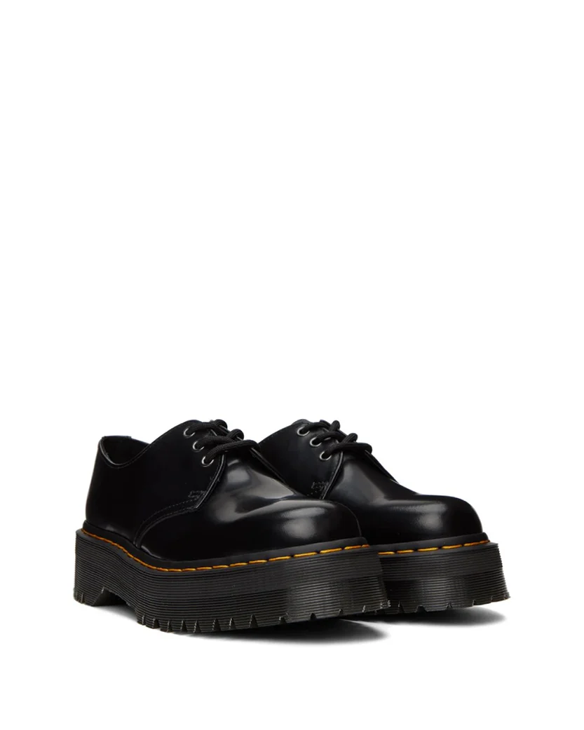 Ці туфлі виготовлені з гладкої полірованої шкіри, що вирізняється міцністю і блиском. Хоча шкіра спочатку може бути доволі жорсткою, з часом вона розноситься, стаючи більш гнучкою і зручною. Модель має підошву Quad Retro, висота якої становить приблизно 3.8 см. Вона перетворює класичні туфлі 1461 на справжній модний акцент. Висока платформа цих туфель ідеально доповнює широкі штани та інші елементи сучасного гардероба, створюючи сміливий і помітний образ. Класичні елементи Dr. Martens, як-от жовта прошивка, додають туфлям впізнаваності та стилю.