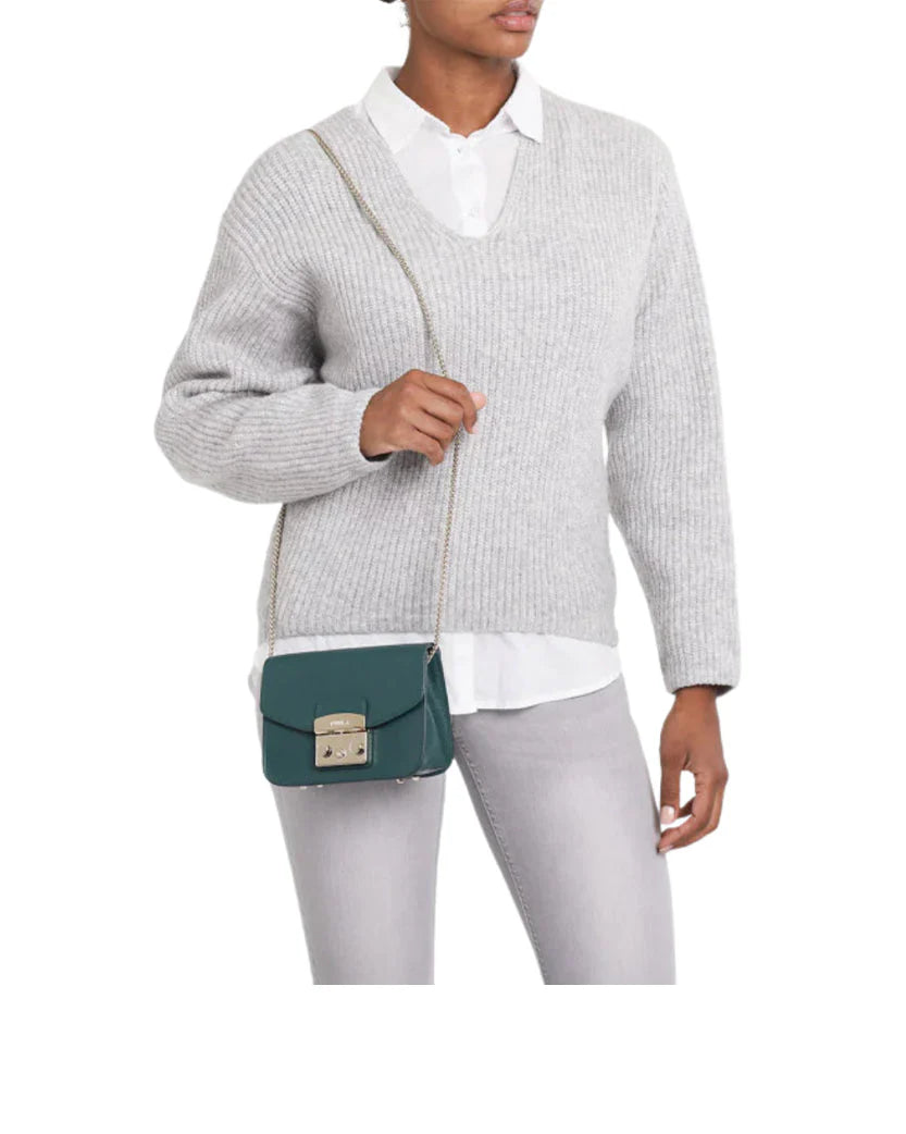 Furla Metropolis - це вишукана і стильна міні-сумка через плече, яка поєднує в собі високу якість та естетичну привабливість. Виготовлена з високоякісної текстурованої шкіри, вона відзначається компактними розмірами та ремінцем-ланцюжком, що забезпечує легкість і комфорт у носінні. Сумка оснащена замком-турникетом та має невелику внутрішню кишеню для зручного зберігання дрібниць