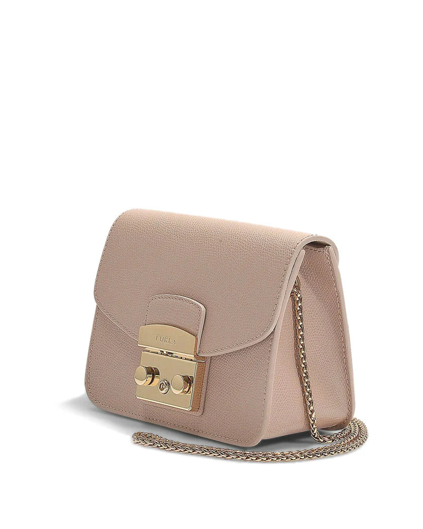 Furla Metropolis - це вишукана і стильна міні-сумка через плече, яка поєднує в собі високу якість та естетичну привабливість. Виготовлена з високоякісної текстурованої шкіри, вона відзначається компактними розмірами та ремінцем-ланцюжком, що забезпечує легкість і комфорт у носінні. Сумка оснащена замком-турникетом та має невелику внутрішню кишеню для зручного зберігання дрібниць
