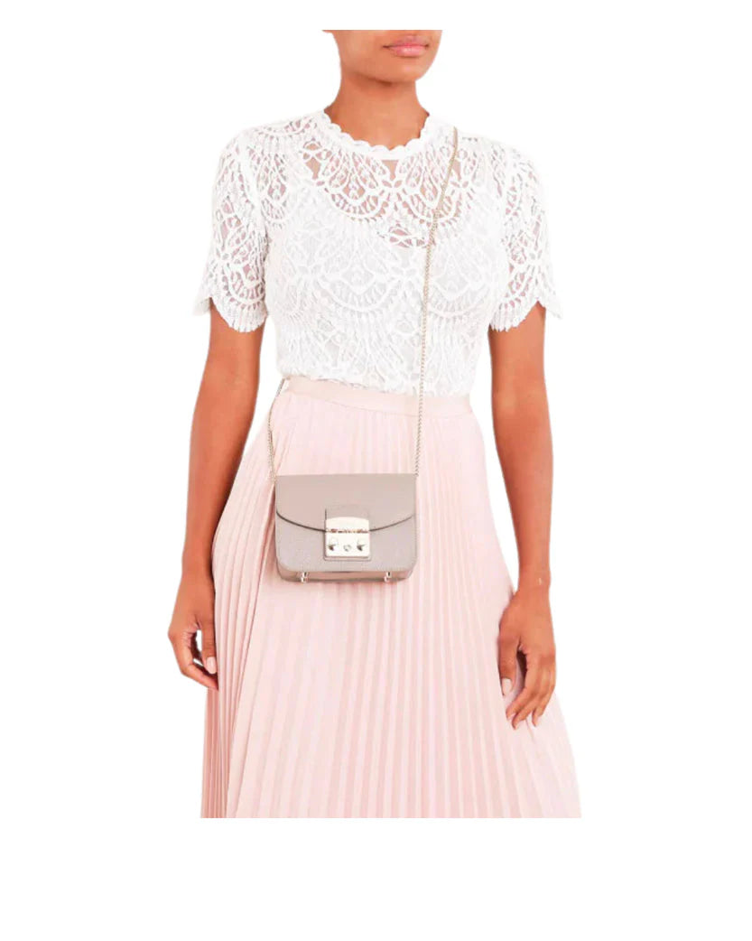 Furla Metropolis - це вишукана і стильна міні-сумка через плече, яка поєднує в собі високу якість та естетичну привабливість. Виготовлена з високоякісної текстурованої шкіри, вона відзначається компактними розмірами та ремінцем-ланцюжком, що забезпечує легкість і комфорт у носінні. Сумка оснащена замком-турникетом та має невелику внутрішню кишеню для зручного зберігання дрібниць.
