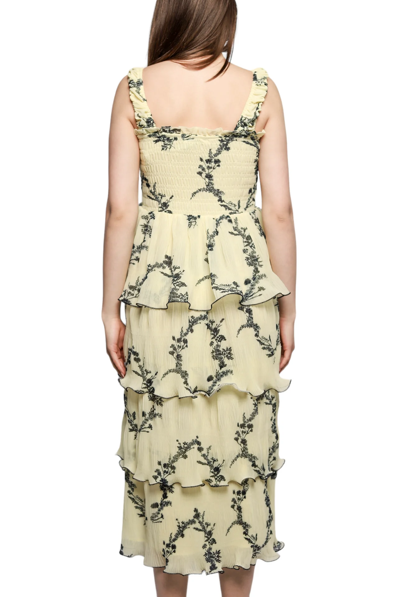 GANNI Floral Pleated Georgette Midi Dress Yellow