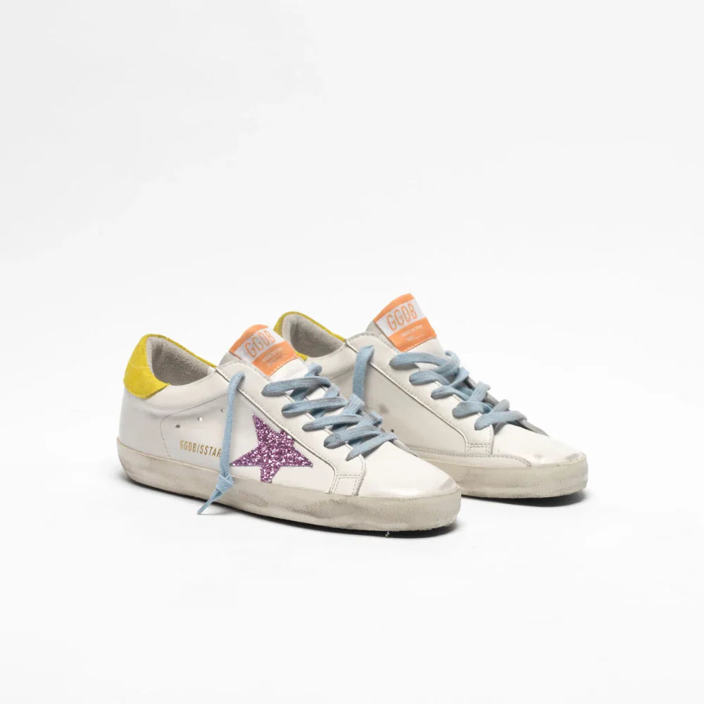 Golden Goose Superstar Sneakers With Pink Glittery Star and Yellow
