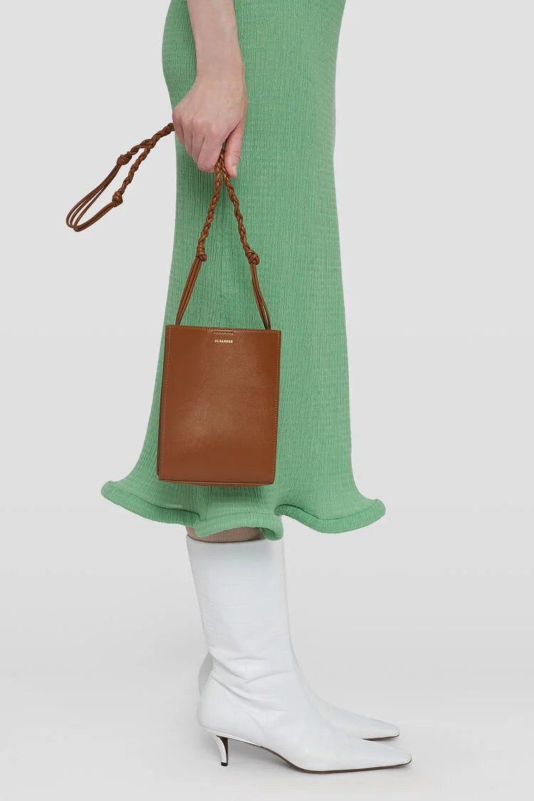 Мінімалістична сумка від Jil Sander виготовлена з гладкої італійської шкіри коричневого кольору. Вона має кручену плечову ремінь і тиснений логотип спереду, що додає їй елегантності та вишуканості.