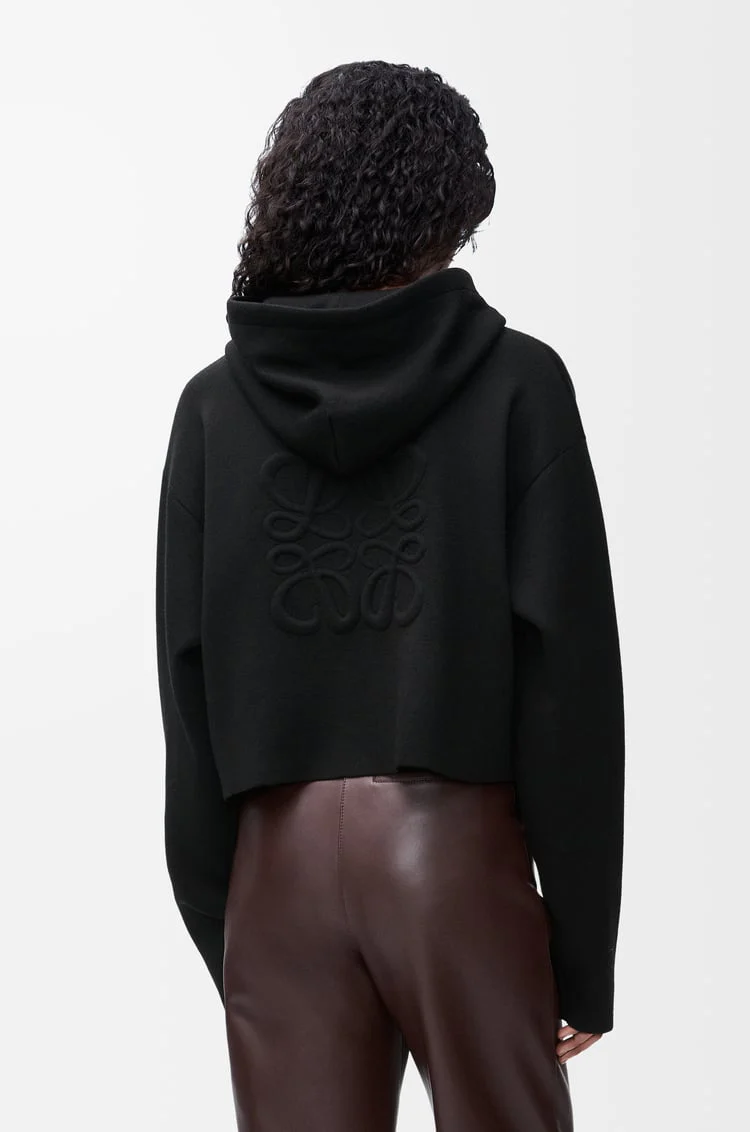 Худі з капюшоном Loewe Anagram у чорному кольорі - це зразок комфорту та стилю. Виготовлене з високоякісного вовняного матеріалу, що забезпечує затишок та зручність у носінні. Логотип Loewe, який розташований на спині, додає цьому виробу оригінальності та стилю. Чорний колір створює класичний і універсальний вигляд, що робить це худі ідеальним вибором для різних образів та сезонів. Завдяки зручній застібці-блискавці і капюшону, ця модель стане невід'ємною частиною вашого гардеробу.