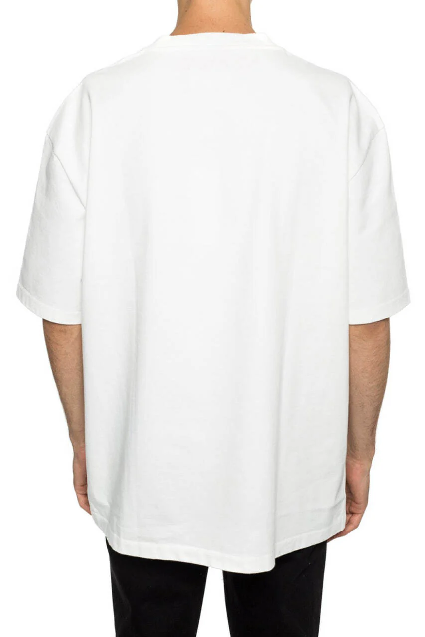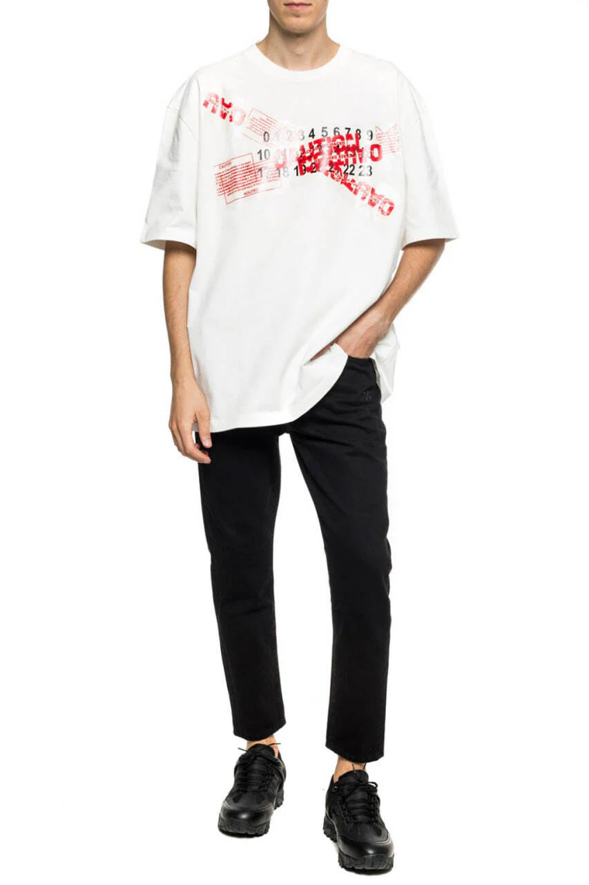 Біла футболка оверсайз від Maison Margiela виготовлена з бавовни. Спереду прикрашена принтом логотипу в кремовому, червоному і чорному кольорах. Кругла горловина, короткий рукав, знаковий логотип у чотири стібки ззаду.