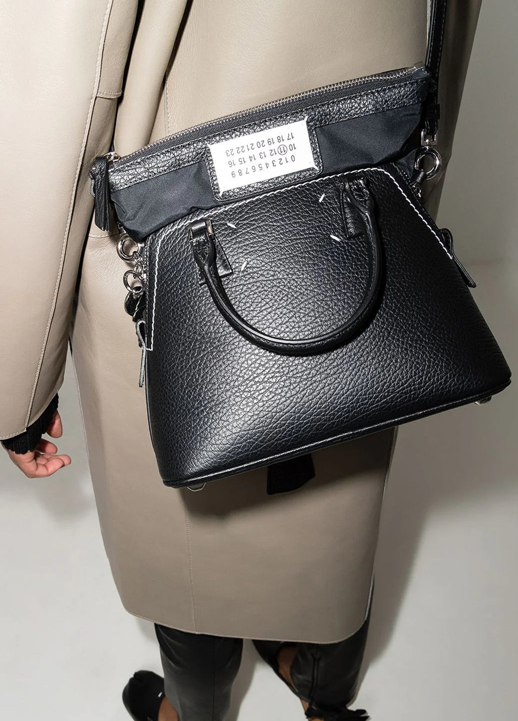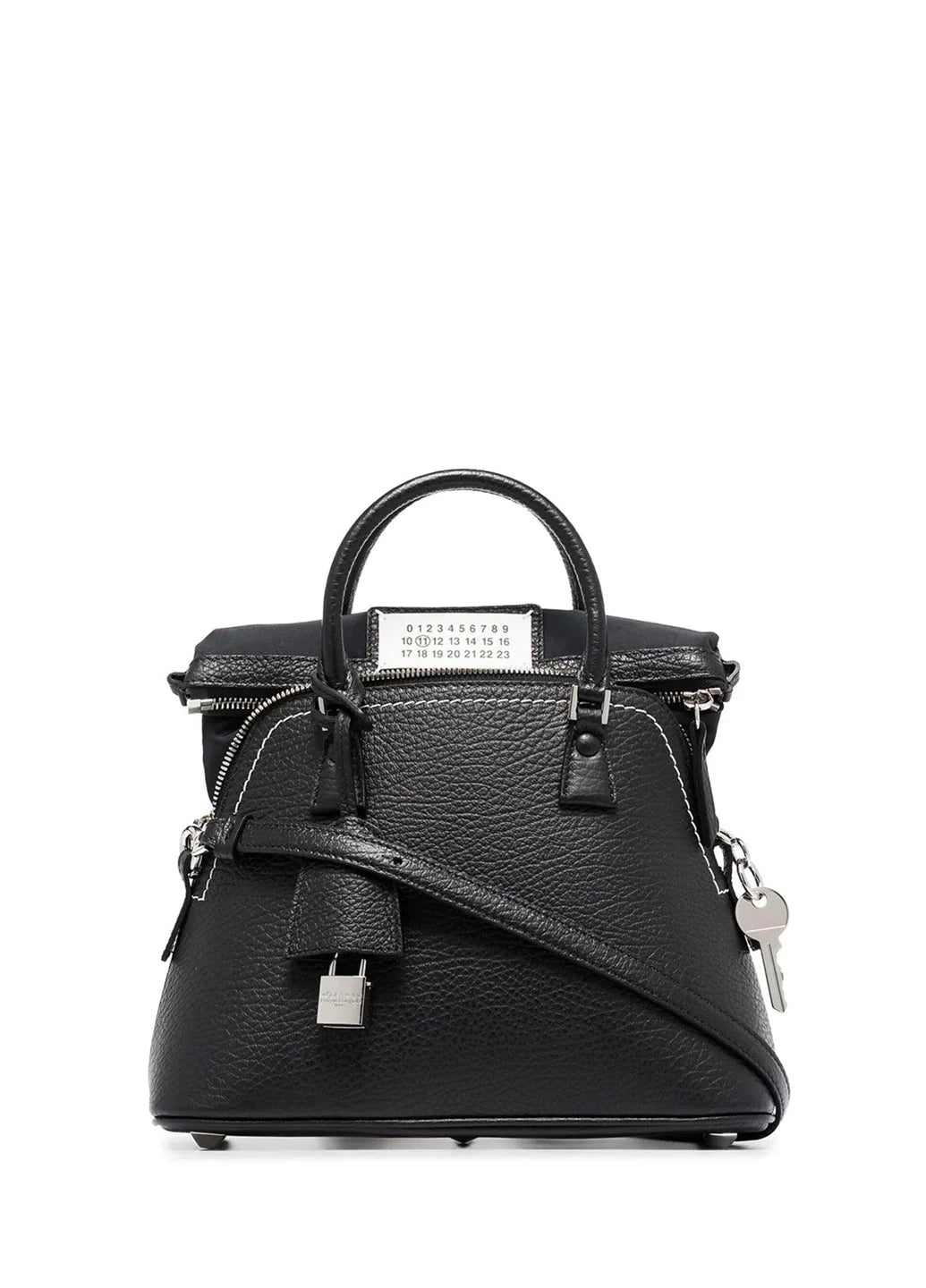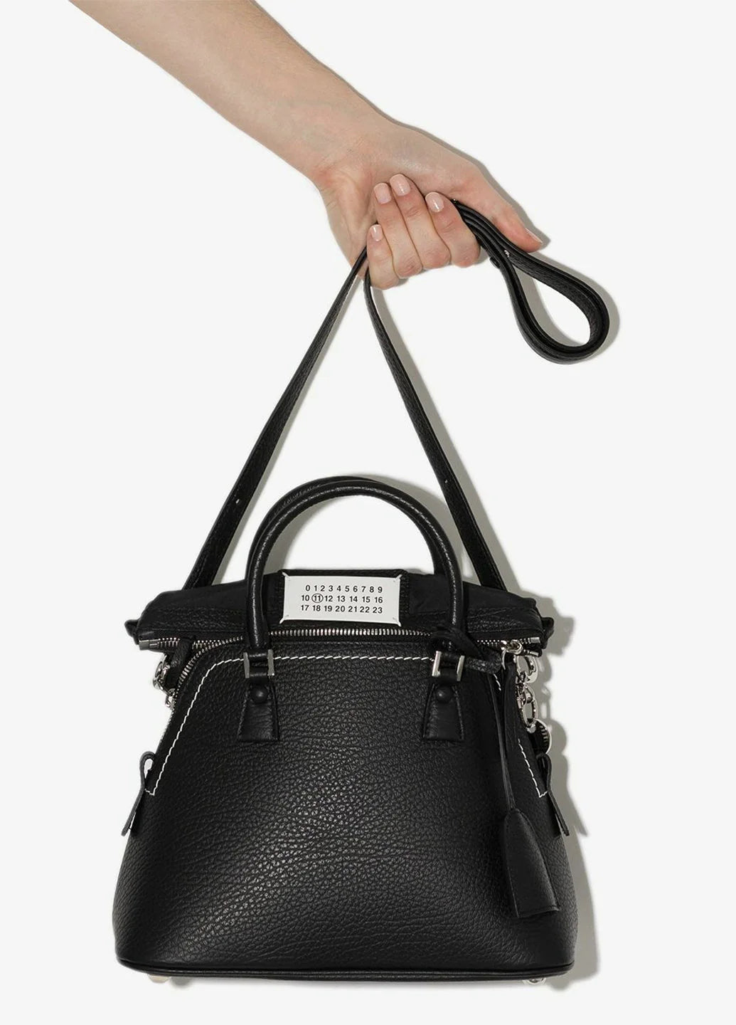 Міні-сумка M5AC від Maison Margiela вражає своєю якістю та стилем. Виготовлена з чорної зернистої шкіри з ефектом зворотної підкладки, вона відмінно підійде для вечірнього виходу або повсякденного використання.
