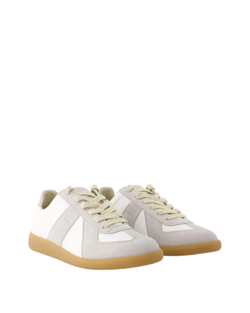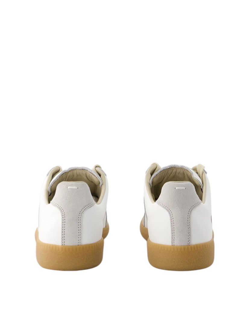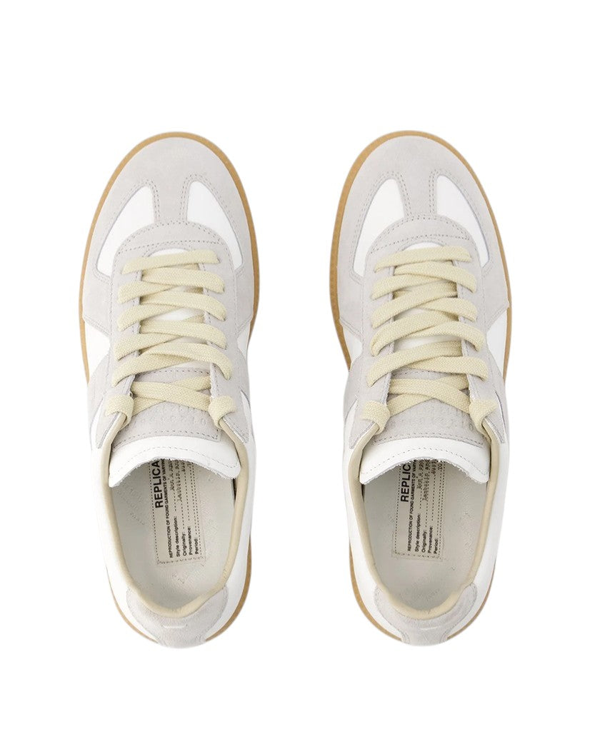 Maison Margiela Replica Sneakers — легендарна модель, що переосмислює класичне спортивне взуття 70-х років через призму сучасного дизайну. Виготовлені з преміальної шкіри наппа у поєднанні з м’якою замшею, ці кросівки поєднують мінімалістичну естетику з продуманою функціональністю. Гнучка гумова підошва гарантує зносостійкість і зчеплення, а м’яка бавовняна підкладка — комфорт у щоденному носінні. Завершальними акцентами слугують фірмова номерна етикетка на язичку та характерне ручне маркування. Модель втілює ідею колекції «Replica» як даниною архівній моді з актуальним трактуванням від Maison Margiela.