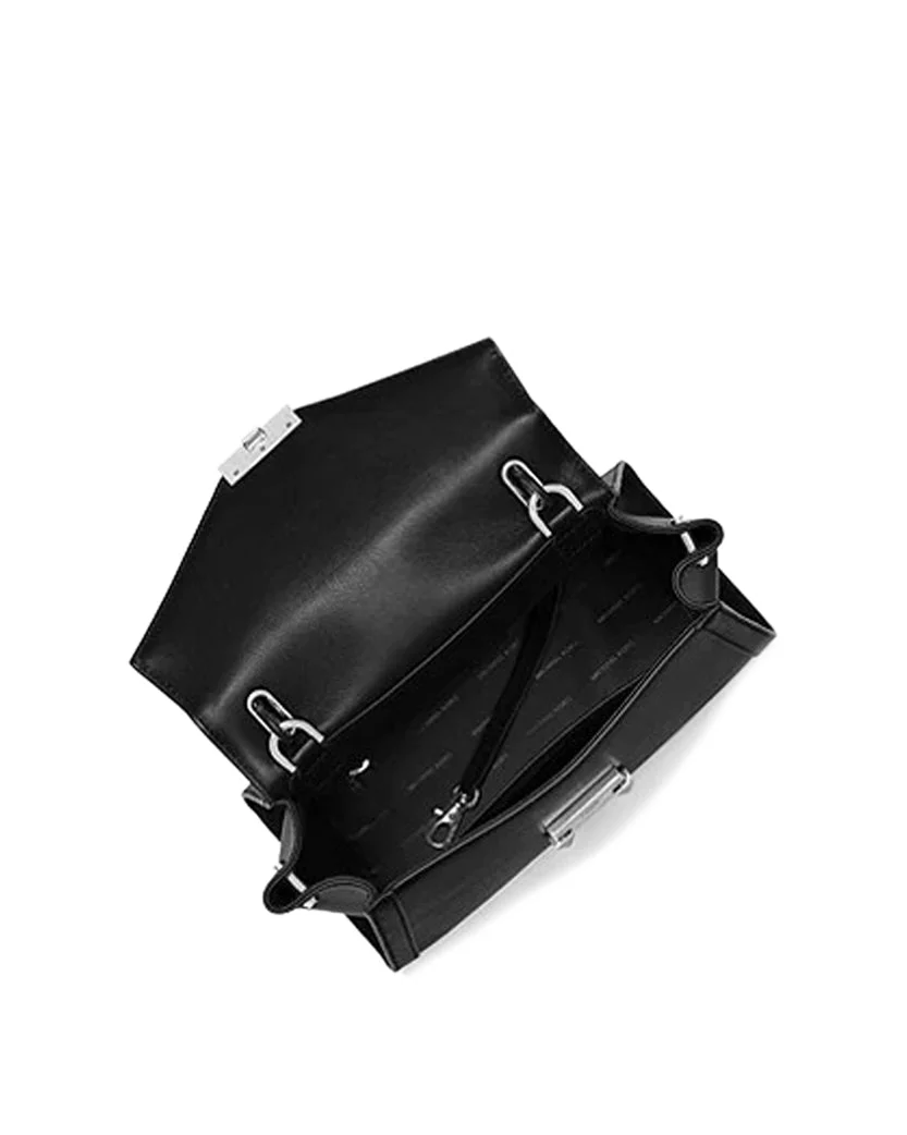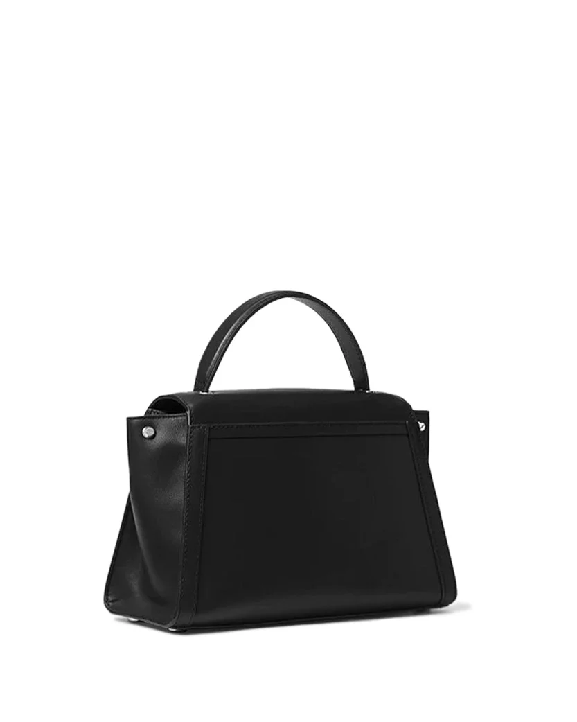 Ця чорна шкіряна сумка має клапан з портфельною застібкою, що надає їй класичний та розкішний вигляд. Закруглена ручка додає комфорту під час носіння, а регульований знімний ремінь на плече дозволяє носити сумку різними способами.