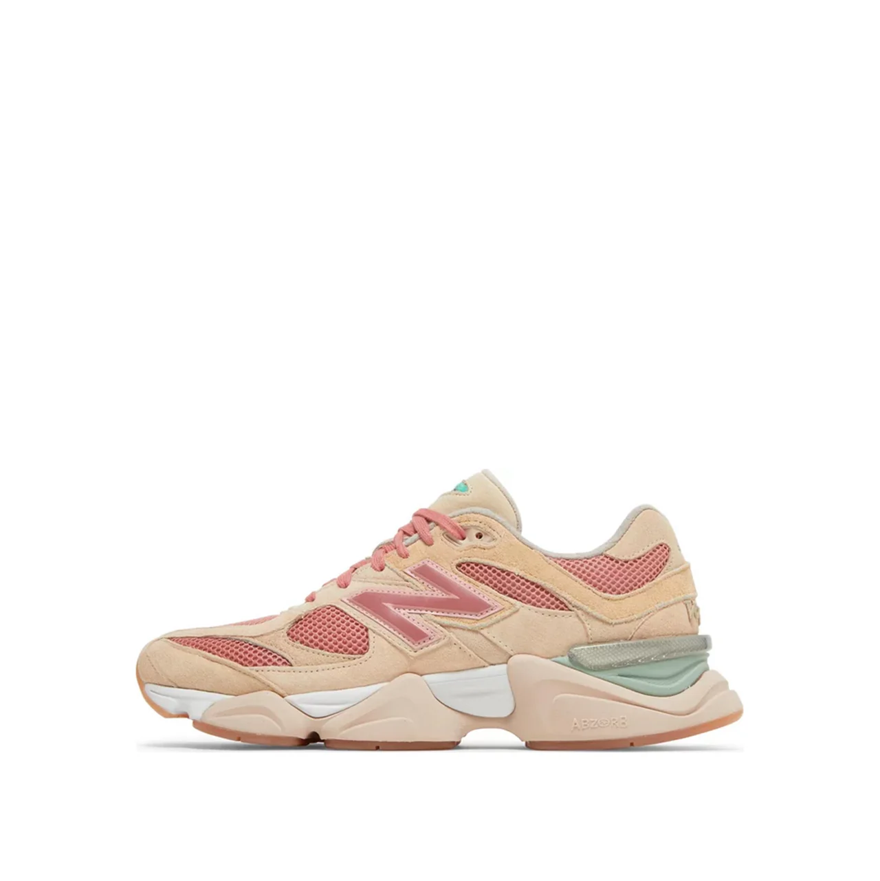 Кросівки New Balance x Joe Freshgoods 9060 Ivory Cream взяті з колекції 'Inside Voices', яка є продовженням колаборації дизайнера з Чикаго 'Outside Clothes', що вийшла у 2021 році. Ця спільна робота представляє новий силует, що поєднує впливи культової серії 990 з класичними кросівками початку 2000-х років. Верх поєднує дихаючу рожеву сітку, замшеві накладки персикового кольору та стьобану текстильну підкладку. Брендингові елементи включають рожевий логотип "N" та напис "Inside Voices", вишиті на задниках лівого та правого кросівок. Легку амортизацію забезпечує роздвоєна проміжна підошва ABZORB, яка підтримується підошвою з гуми.