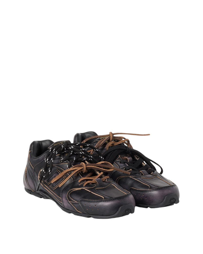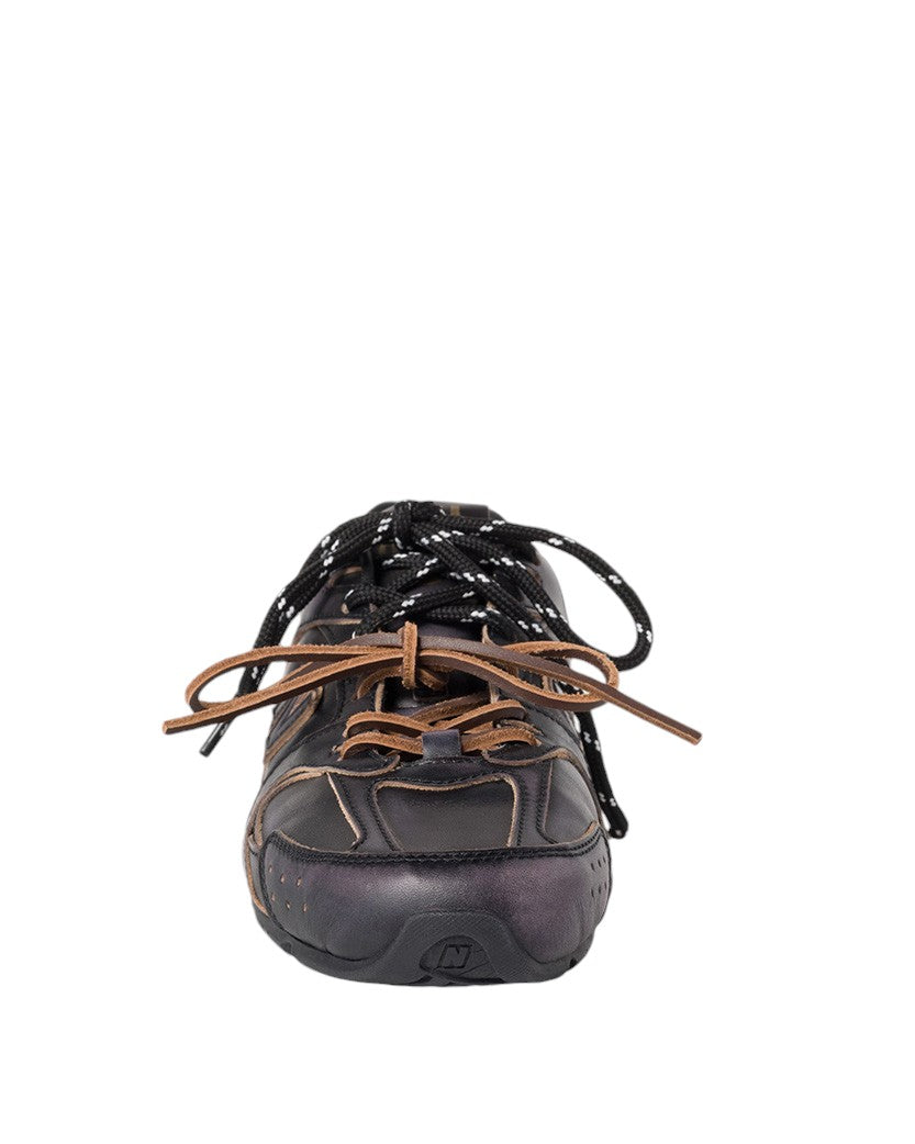 Цей ексклюзивний вінтажний дизайн зі шкіри є результатом співпраці Miu Miu та New Balance. Miu Miu повністю переосмислили конструкцію, зробивши її надзвичайно легкою, і додали гру з контрастними мереживами в кольорі та фактурі. Логотип гармонійно доповнює дизайн, додаючи знаковий бренд-штрих.