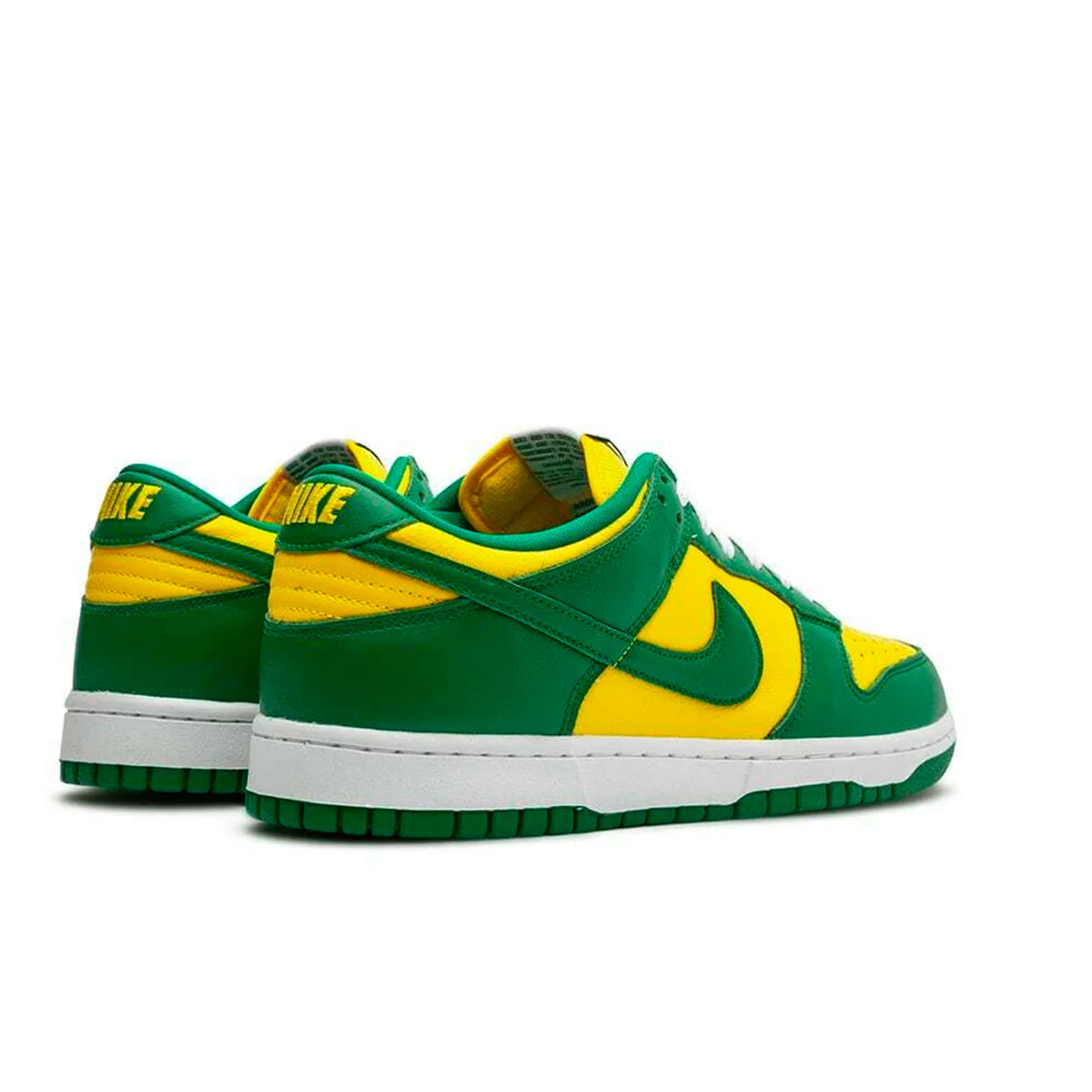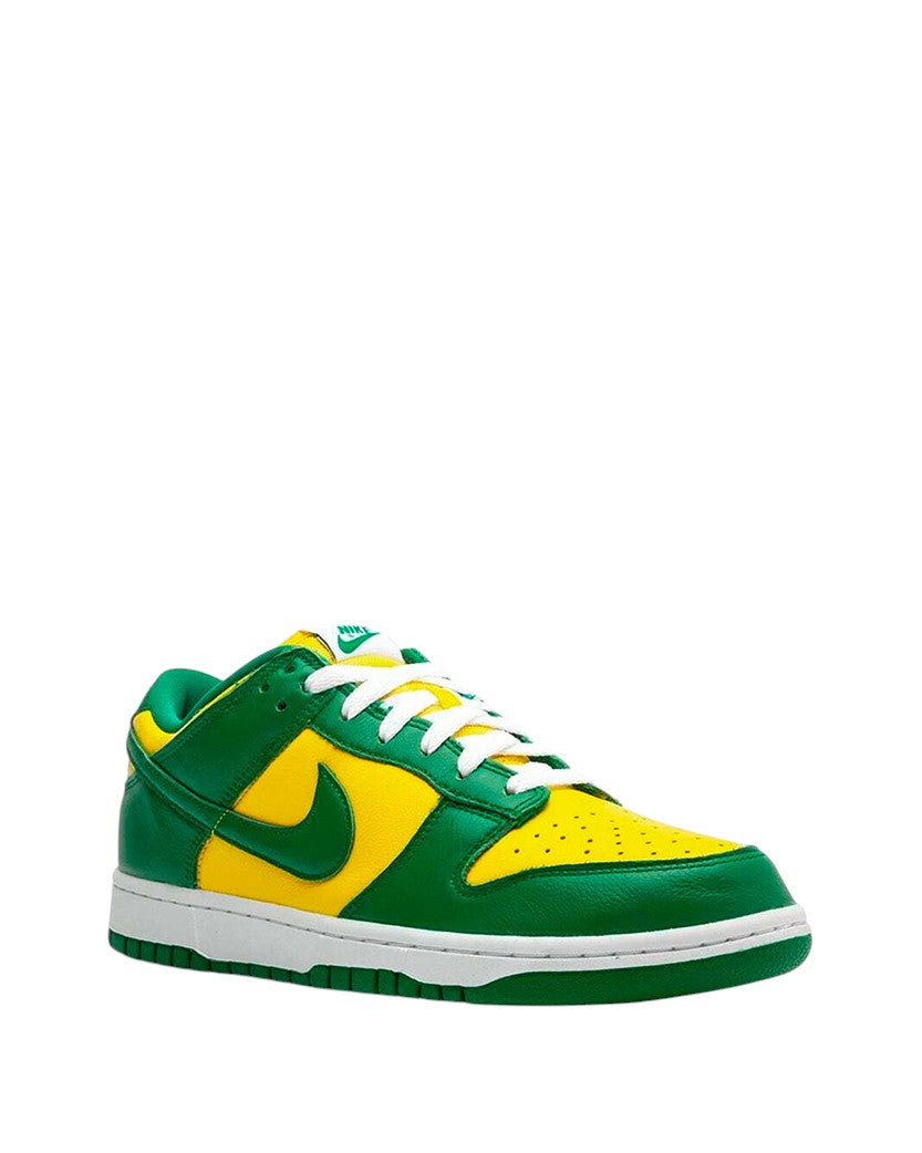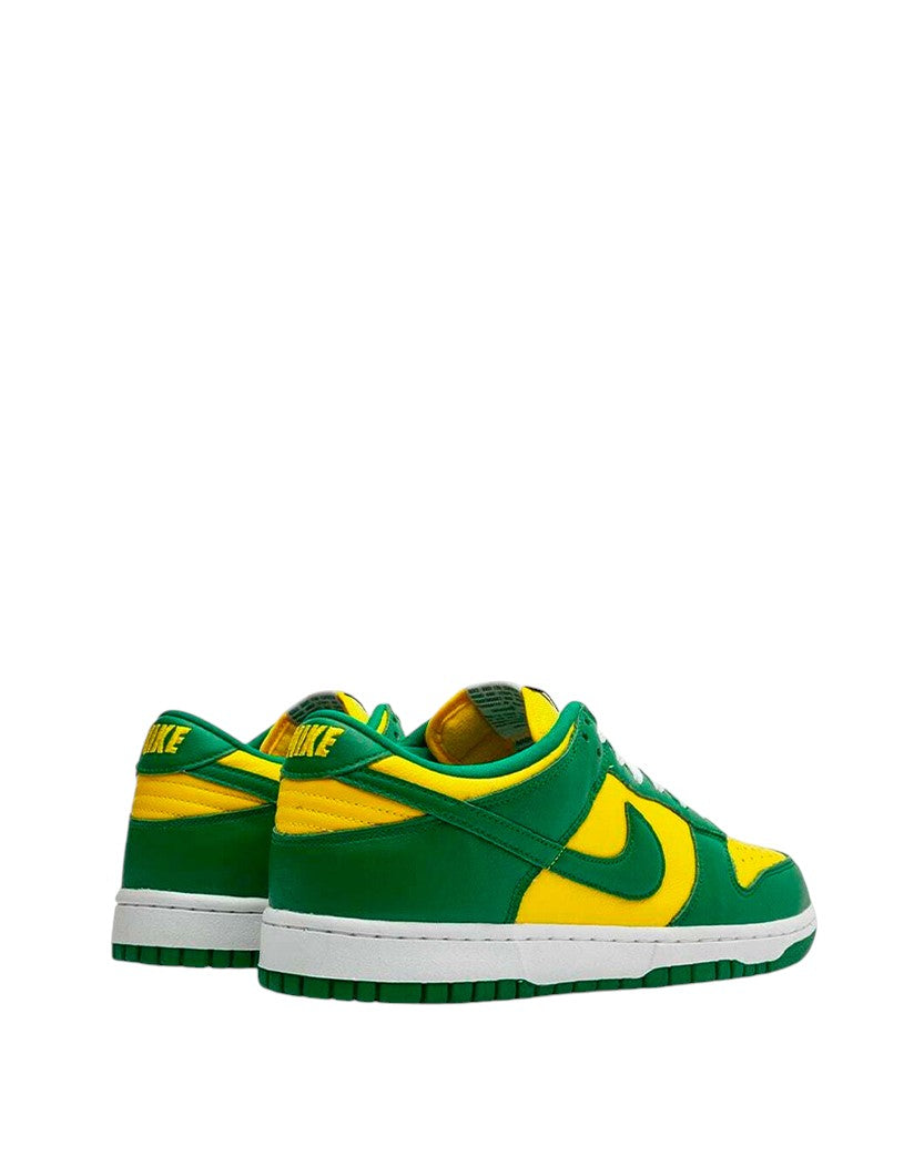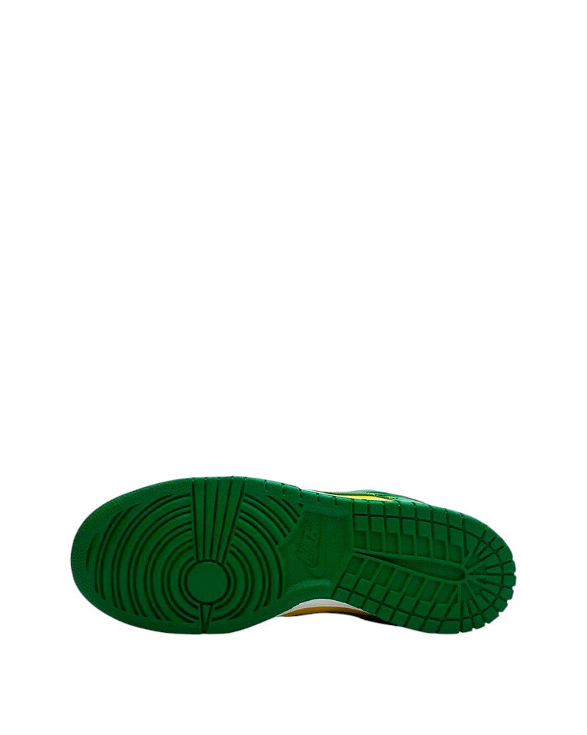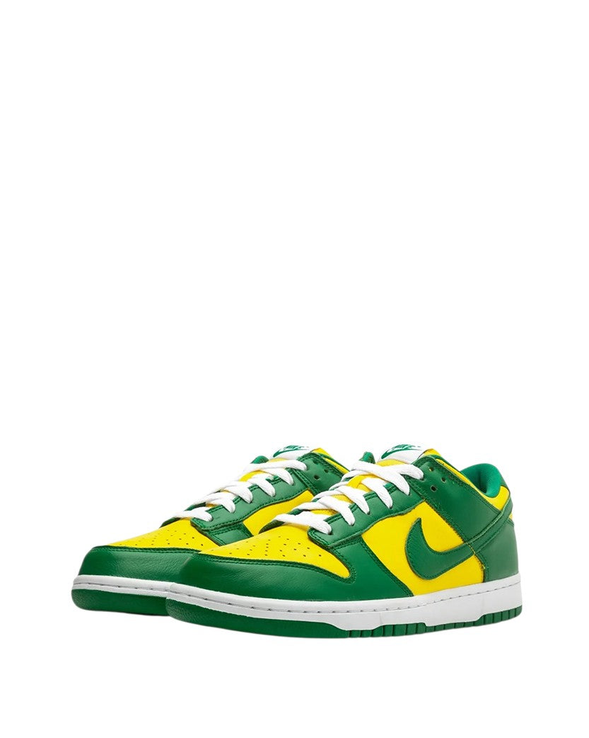 Кросівки Nike Dunk Low Brazil повторюють зовнішній вигляд класичної моделі Dunk 'Brazil' 2001 року, вирізняючись простою двоколірною гамою, що поєднує жовту шкіряну основу з контрастними зеленими накладками. Брендинг Nike прикрашає п'яткову накладку та пришитий тканий ярлик на злегка м'якому нейлоновому язичку. Низькопрофільний силует встановлений на міцній білій пінопластовій проміжній підошві, укріпленій під ногами зеленою гумовою підошвою.