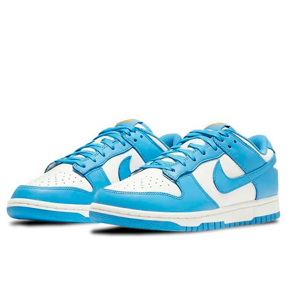 Жіночі кросівки Dunk Low Coast від Nike вирізняються традиційним двоколірним блокуванням на шкіряному верху, що зберігає зовнішній вигляд оригінального випуску 1985 року. Чіткий білий колір основи, прикрашений перфорованими деталями на носку, контрастує з накладками яскравого синього кольору. Логотип Nike на п'ятковій накладці та тканий язичок виконані у несподіваному жовтому кольорі. Кросівки стоять на низькопрофільній проміжній підошві, яка підтримується гумовою підошвою з концентричними колами на протекторі.