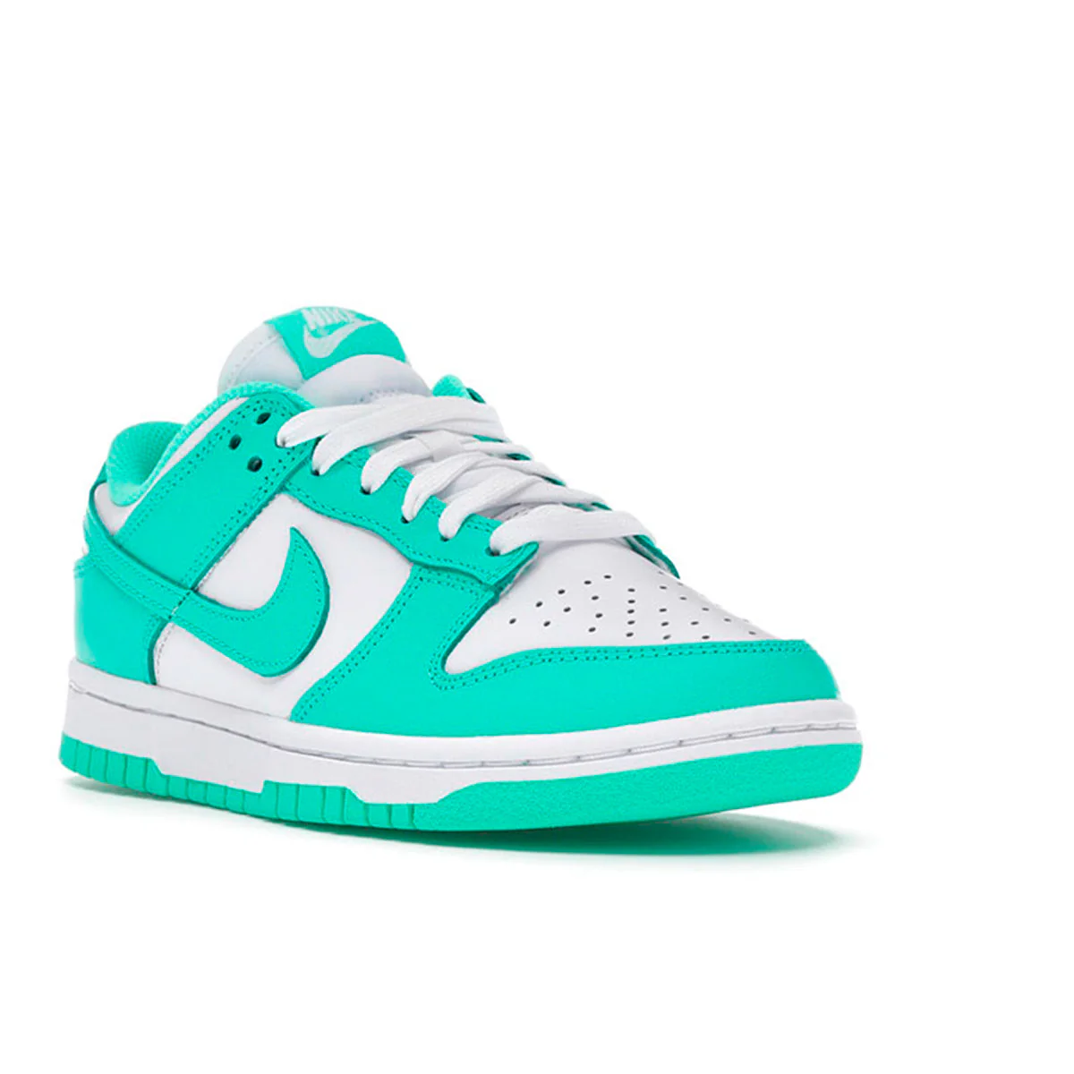 Жіночі кросівки Nike Dunk Low Green Glow демонструють традиційне кольорове блокування на звичній суцільношкіряній конструкції. Чіткий білий колір основи контрастує з яскравим відтінком зеленого кольору на носковій частині кросівок, Swoosh, а також на накладках передньої частини стопи та п'яти. Зелений відтінок повторюється на плетеному язичку та п'ятковій накладці, позначених стандартним брендингом Nike. Низькі кросівки стоять на двоколірній гумовій підошві, оснащеній чіпкою підошвою, яка спочатку була розроблена для ковзання по твердій деревині.