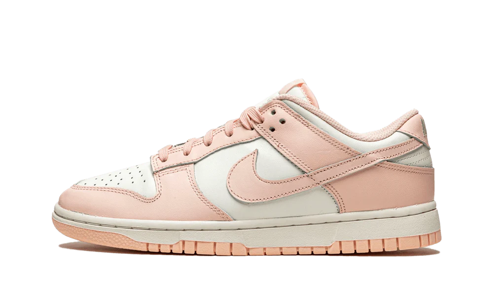 Жіночі кросівки Nike Dunk Low Orange Pearl - це пастельний відтінок класичних низьких кросівок, виконаний у традиційному колор-блокінгу, що нагадує про коріння взуття з 80-х років. Верх має білосніжну основу з контрастними накладками блідо-коралового відтінку. Традиційні деталі Dunk включають перфоровану вставку на носку та злегка м'який нейлоновий язичок, позначений тканою біркою Nike. Кросівки підтримуються двокольоровою гумовою підошвою, оснащеною специфічним для баскетболу малюнком зчеплення, зробленим для поворотів.