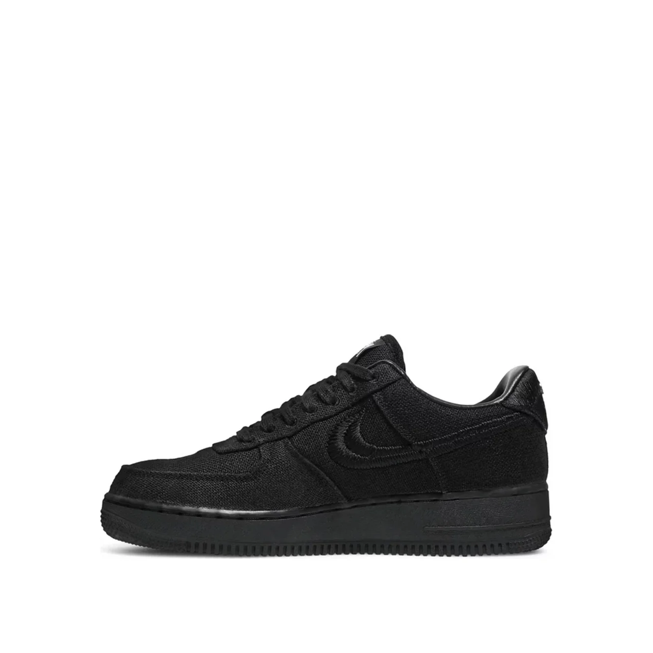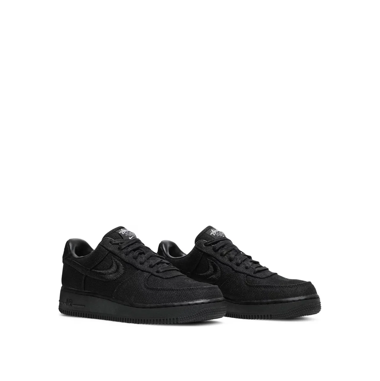 Розроблені у співпраці з південнокаліфорнійським брендом вуличного одягу Nike x Stussy Air Force 1 Low Black використовують дихаючу конопляну конструкцію замість традиційної шкіряної. Однотонна обробка кросівок доповнена вишитим логотипом Swoosh та подвійною літерою S, вишитою на верхній частині носка. Літери, що переплітаються, повторюються на металевій емблемі, прикріпленій до переплетеної п'ятки, а на бирці на язичку зображена іконографія Stussy's World Tour.