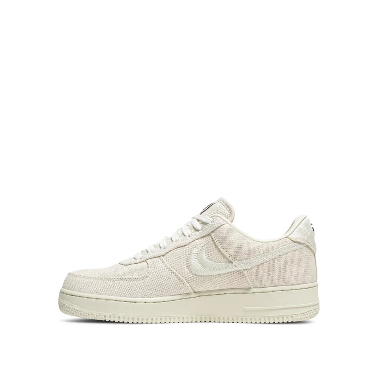 Створені у партнерстві з новаторським брендом вуличного одягу, кросівки Nike x Stussy Air Force 1 Low Fossil оновлюють ретро-низькі кросівки за допомогою верху, виготовленого з натуральної коноплі. Унікальні елементи брендингу включають вишитий у два ряди логотип Swoosh, язичковий ярлик Stussy World Tour та подвійну літеру "S", вшиту на носковій частині кросівок. Останній логотип повторюється на металевій емблемі, що прикрашає переплетену п'ятку. Білосніжна гумова підошва підтримує нейтральну палітру кросівок.