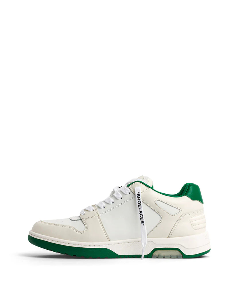 Біло-зелені кросівки Out Of Office від Off-White вирізняються своїм стильним дизайном і якісним матеріалом. Виготовлені зі шкіри, ці кросівки мають шнурівку і кремово-білу гумову підошву, яка забезпечує комфорт і зручність при носінні. Взуття прикрашене знімною аплікацією з логотипом, витисненим логотипом спереду, а також чорним принтом з логотипом на задній частині.