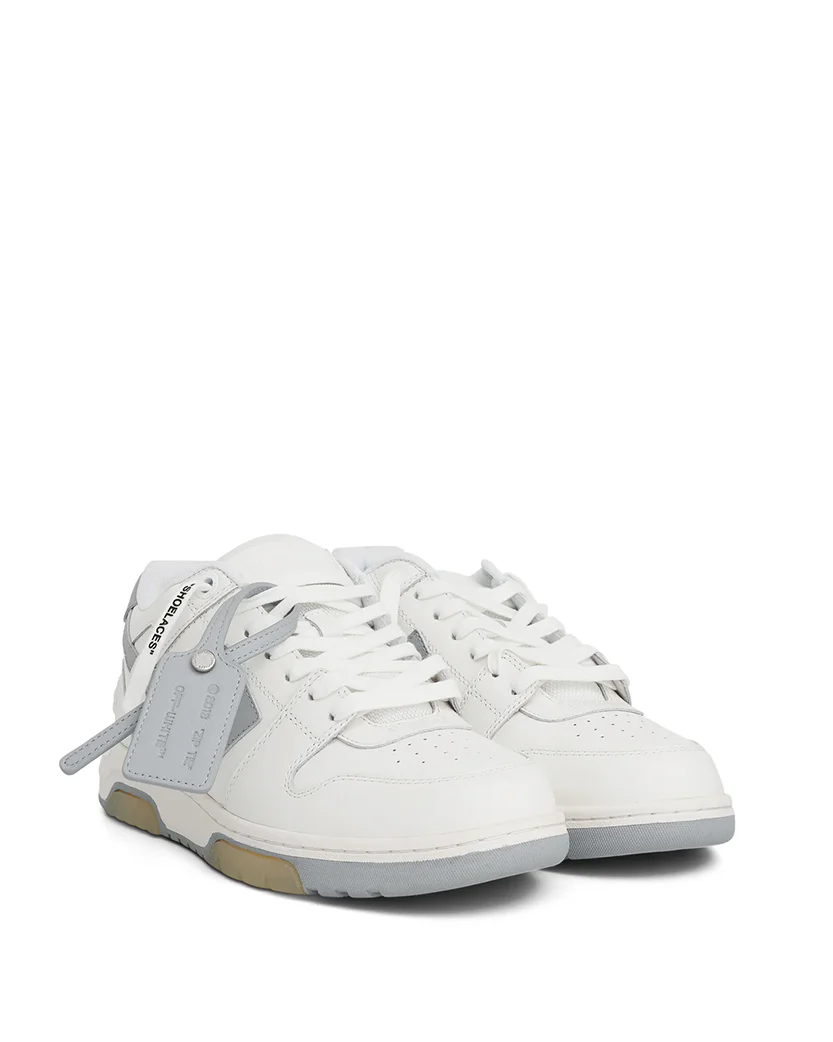 Біло-сірі кросівки Out Of Office від Off-White виготовлені зі шкіри. Ці кросівки на шнурівці, на кремово-білій гумовій підошві, прикрашені знімною аплікацією з логотипом, витисненим логотипом спереду і чорним принтом з логотипом ззаду.