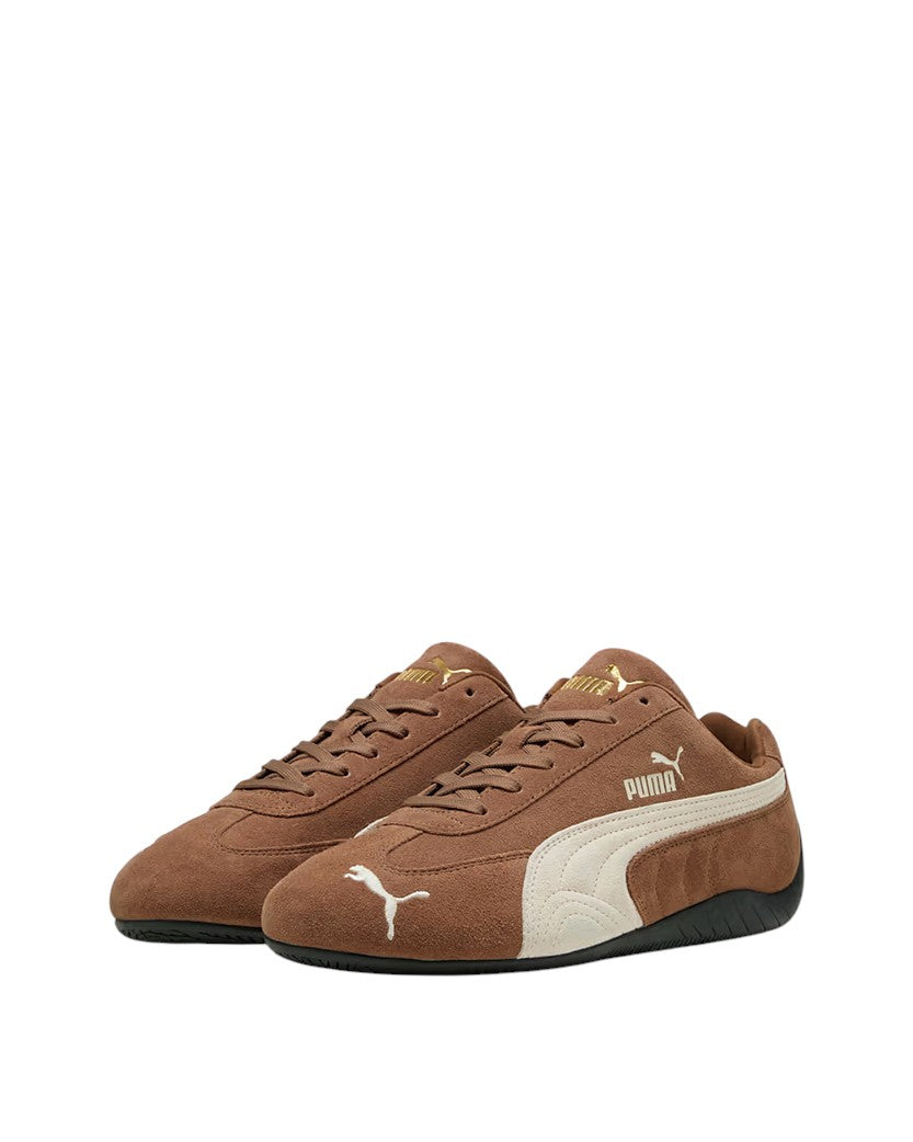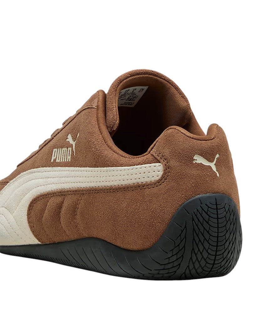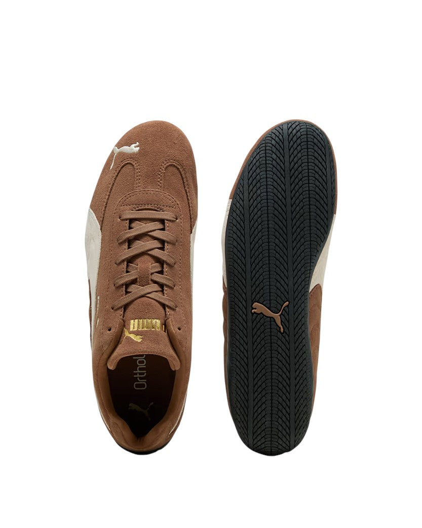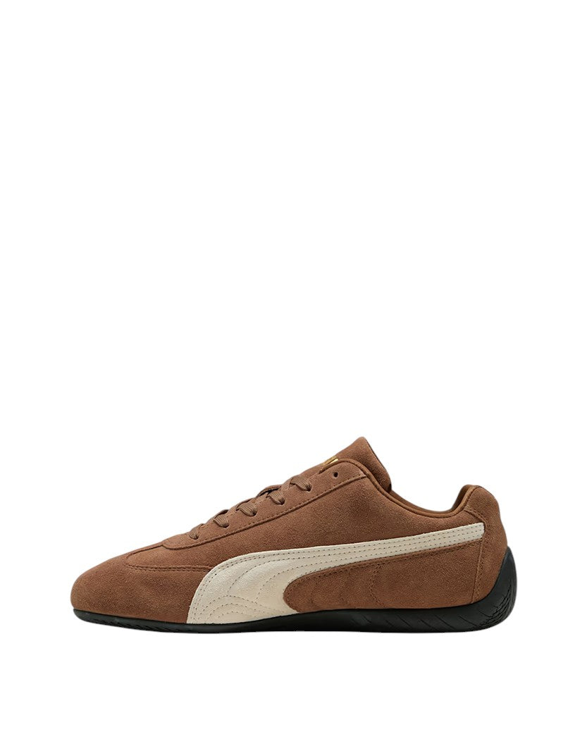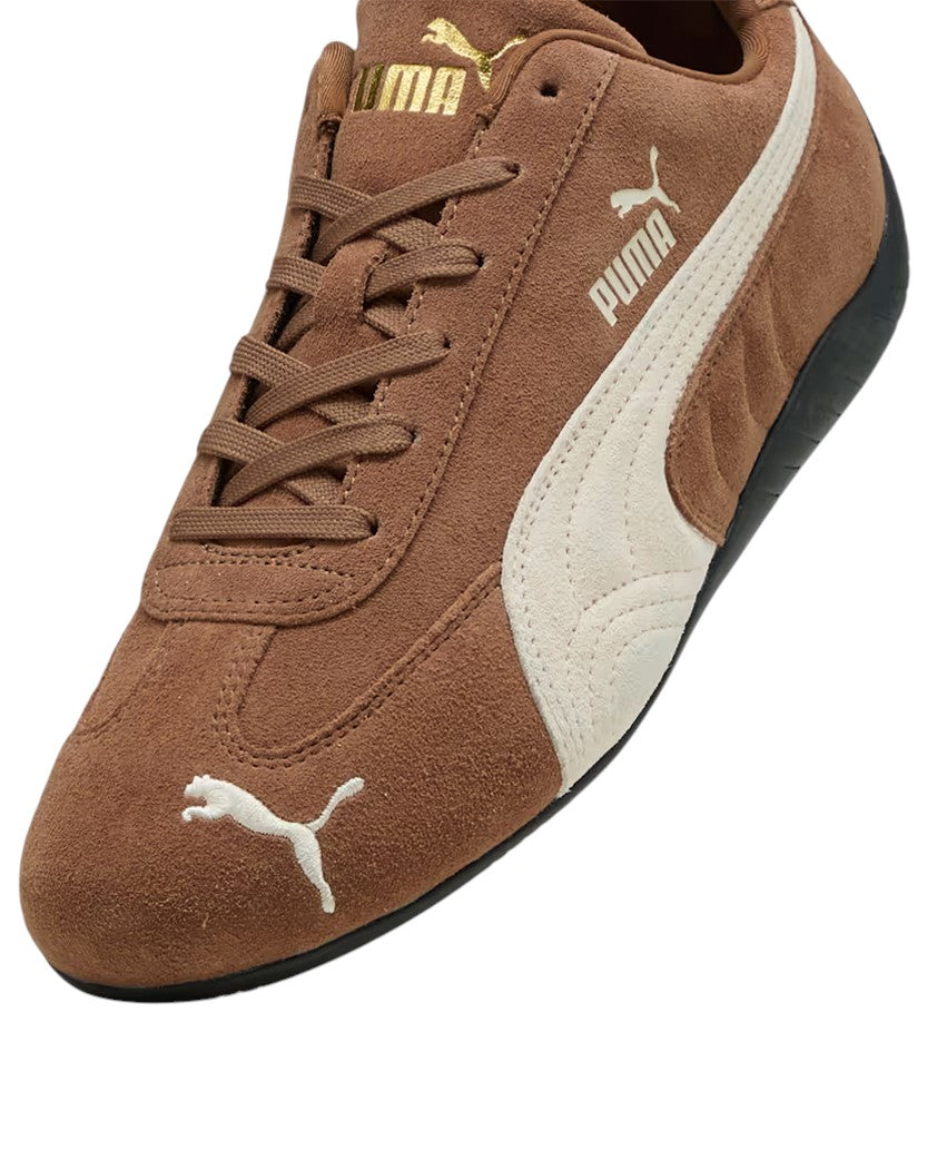 У версії в коричневому кольорі модель вирізняється замшевим верхом преміум-якості, який створює елегантний, лаконічний вигляд. Контрастні елементи у вигляді вигнутої смуги PUMA та золотого брендування додають взуттю виразності. Аеродинамічний силует із закругленим носком і фірмовим логотипом підкреслює стриману вишуканість моделі. Це перевидання поєднує класичну естетику з сучасним баченням — ідеальний вибір для тих, хто цінує стиль і історію бренду PUMA.