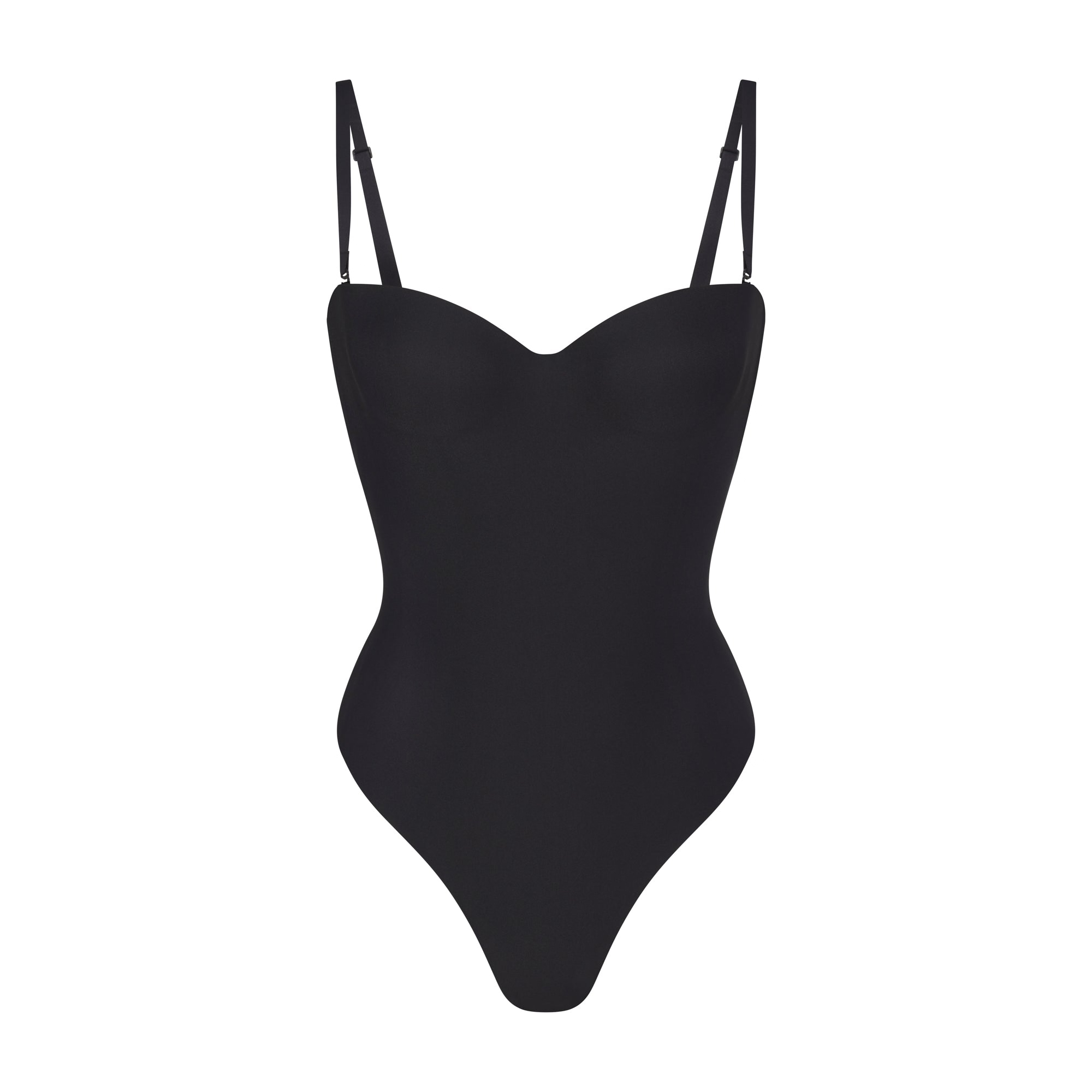 Skims Underwire Thong Bodysuit — це вишуканий боді, що поєднує жіночність, комфорт і підтримку. Модель оснащена м’якими формованими чашками з каркасом для природного контуру, глибоким вирізом для виразного силуету та тонкими регульованими бретелями для ідеальної посадки. Гладка еластична тканина дарує відчуття другої шкіри, а стрінг-крій робить боді непомітним під одягом. Універсальний вибір як для сміливих образів, так і для базового гардеробу.