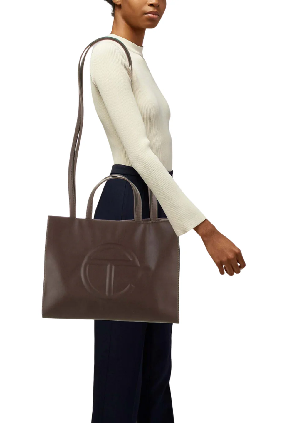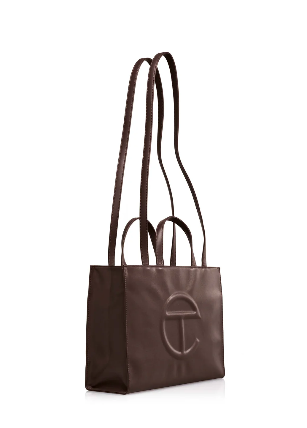 Культова сумка для покупок - практична сумка на кожен день. Вона має подвійні ремінці (ручки та ремінці через плече), тиснений логотип і магнітну застібку. Виготовлена зі штучної шкіри з підкладкою з твілу, сумка поставляється в мішечку зі шнурком з 100% бавовни із трафаретним логотипом.