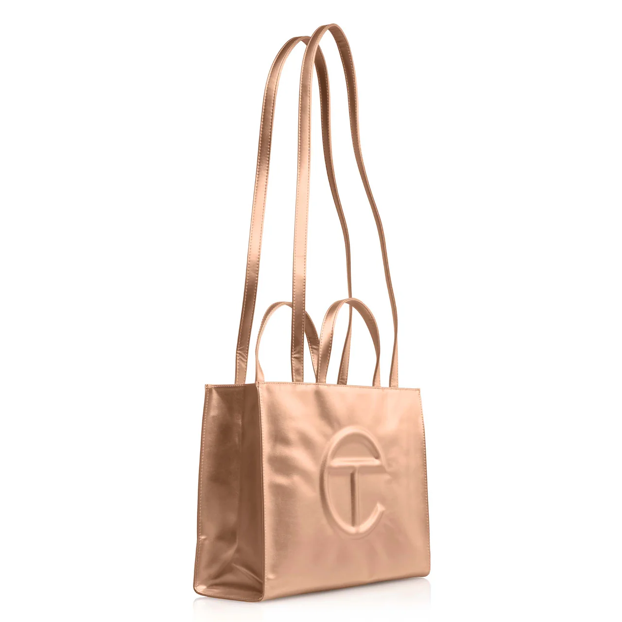 Культова сумка для покупок - практична сумка на кожен день. Вона має подвійні ремінці (ручки та ремінці через плече), тиснений логотип і магнітну застібку. Виготовлена зі штучної шкіри з підкладкою з твілу, сумка поставляється в мішечку зі шнурком з 100% бавовни із трафаретним логотипом.