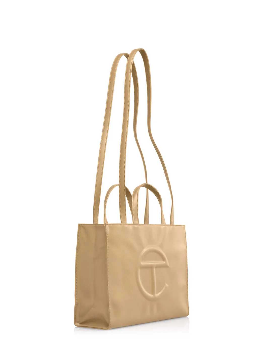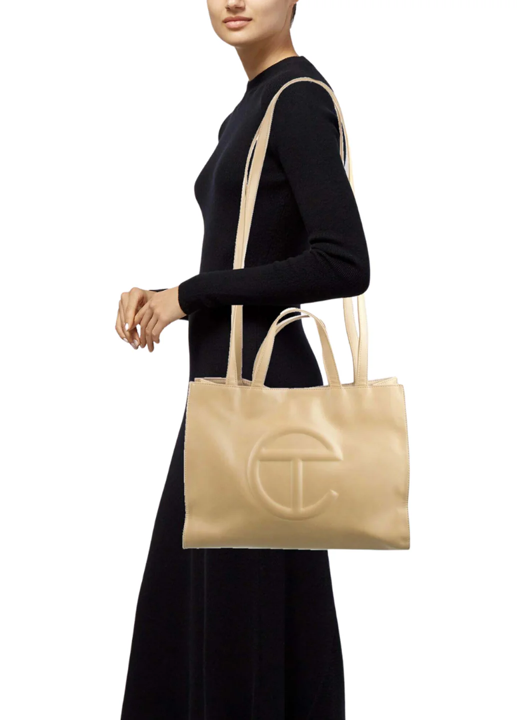 Культова сумка для покупок - практична сумка на кожен день. Вона має подвійні ремінці (ручки та ремінці через плече), тиснений логотип і магнітну застібку. Виготовлена зі штучної шкіри з підкладкою з твілу, сумка поставляється в мішечку зі шнурком з 100% бавовни із трафаретним логотипом.