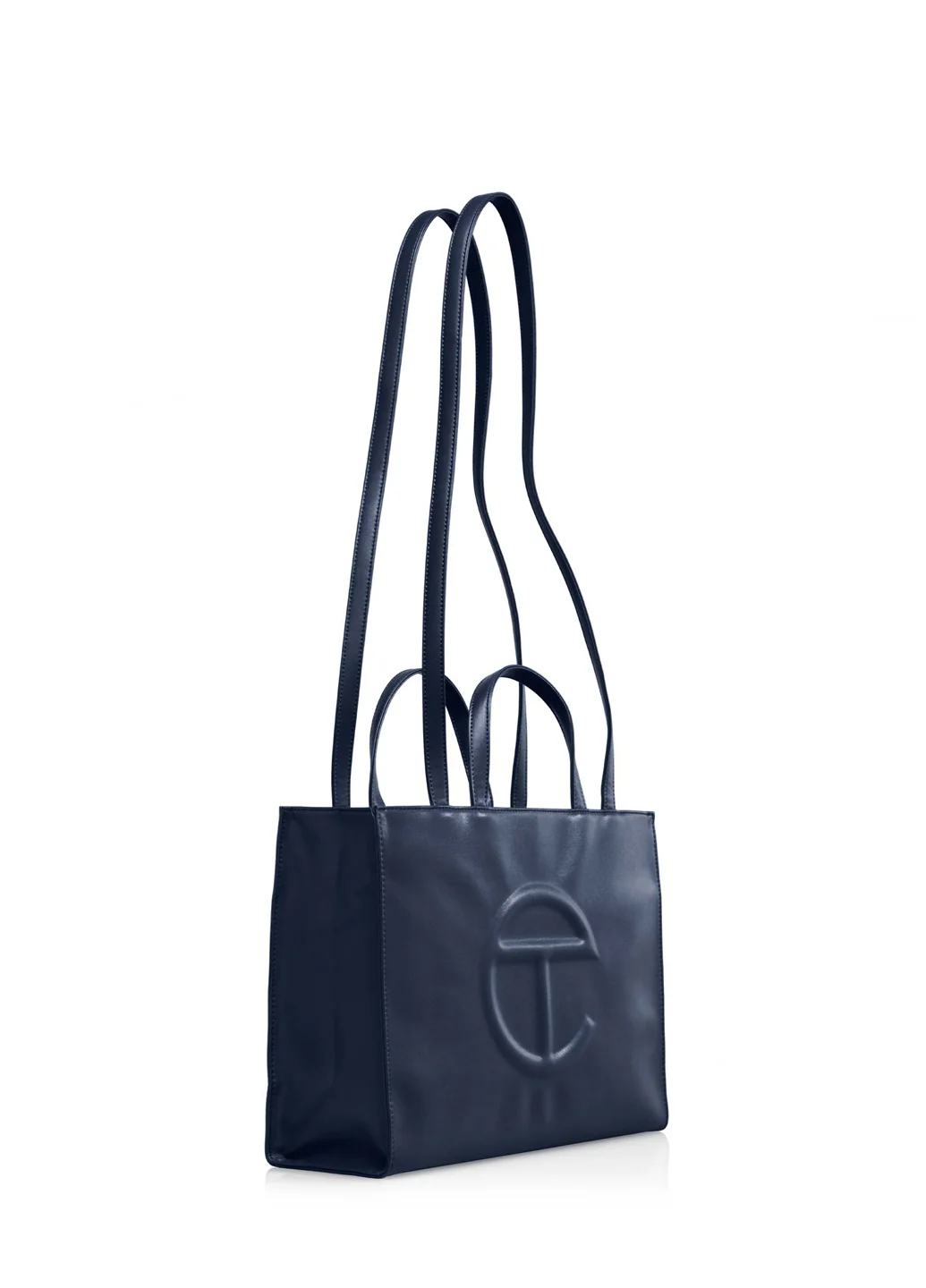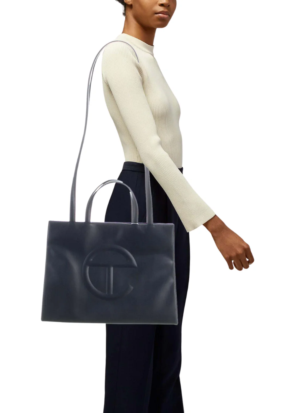 Культова сумка для покупок - практична сумка на кожен день. Вона має подвійні ремінці (ручки та ремінці через плече), тиснений логотип і магнітну застібку. Виготовлена зі штучної шкіри з підкладкою з твілу, сумка поставляється в мішечку зі шнурком з 100% бавовни із трафаретним логотипом.
