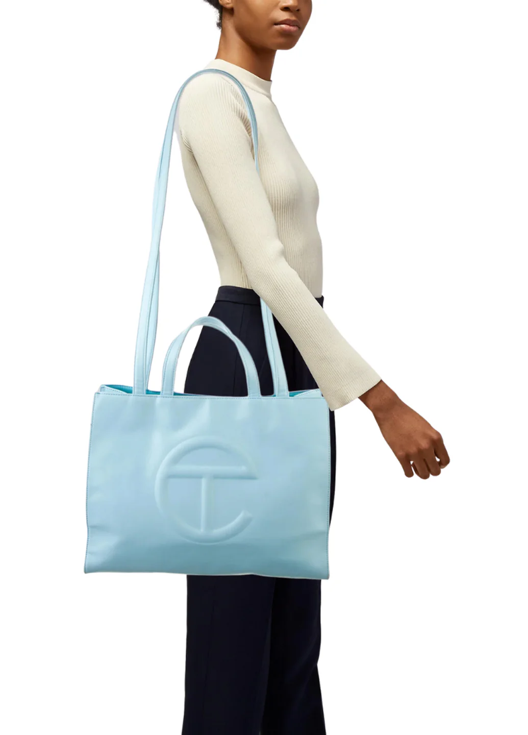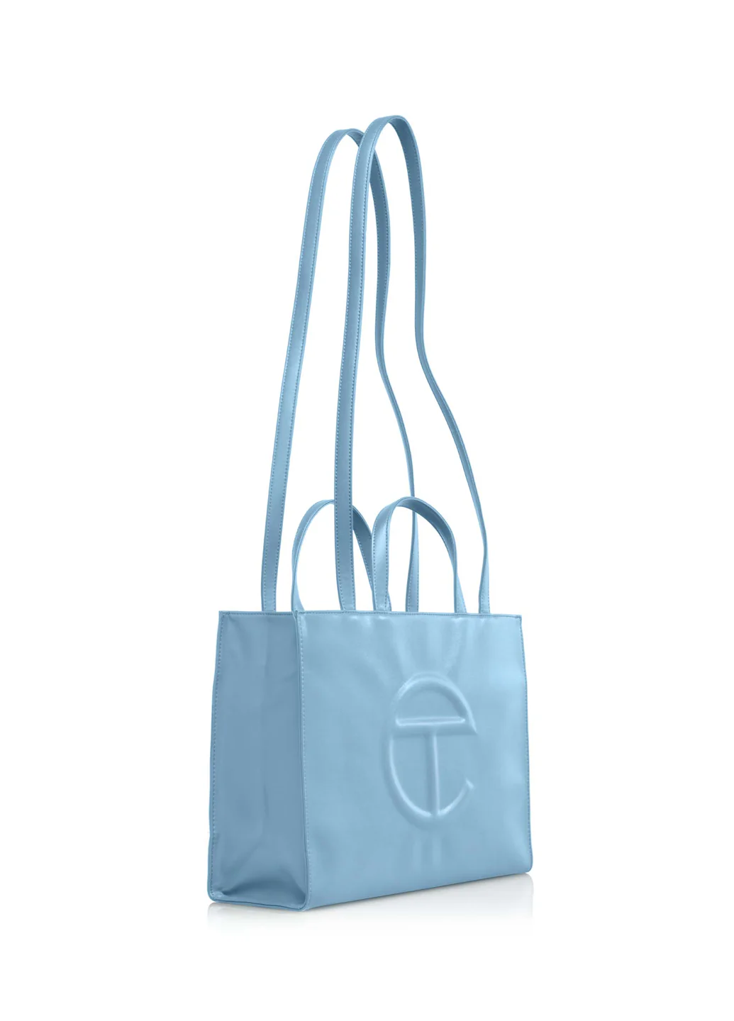 Культова сумка для покупок - практична сумка на кожен день. Вона має подвійні ремінці (ручки та ремінці через плече), тиснений логотип і магнітну застібку. Виготовлена зі штучної шкіри з підкладкою з твілу, сумка поставляється в мішечку зі шнурком з 100% бавовни із трафаретним логотипом.