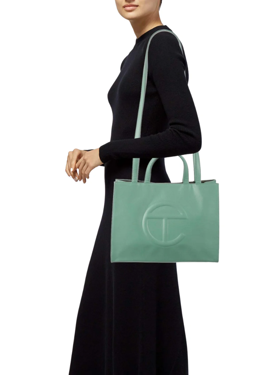 Культова сумка для покупок - практична сумка на кожен день. Вона має подвійні ремінці (ручки та ремінці через плече), тиснений логотип і магнітну застібку. Виготовлена зі штучної шкіри з підкладкою з твілу, сумка поставляється в мішечку зі шнурком з 100% бавовни із трафаретним логотипом.