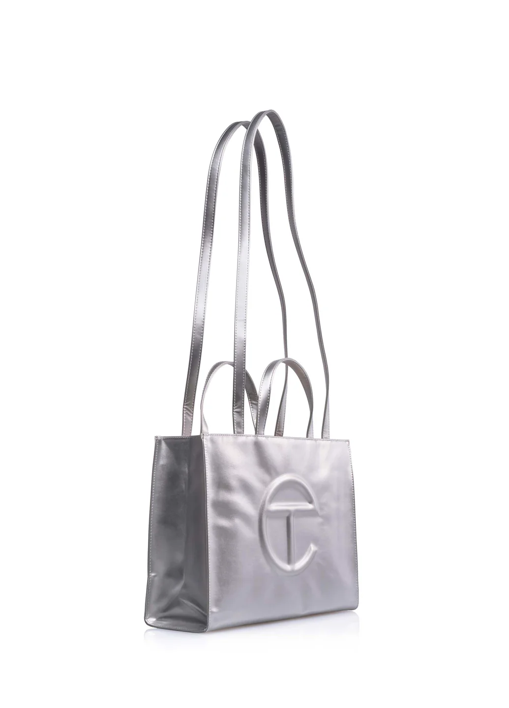 Культова сумка для покупок - практична сумка на кожен день. Вона має подвійні ремінці (ручки та ремінці через плече), тиснений логотип і магнітну застібку. Виготовлена зі штучної шкіри з підкладкою з твілу, сумка поставляється в мішечку зі шнурком з 100% бавовни із трафаретним логотипом.