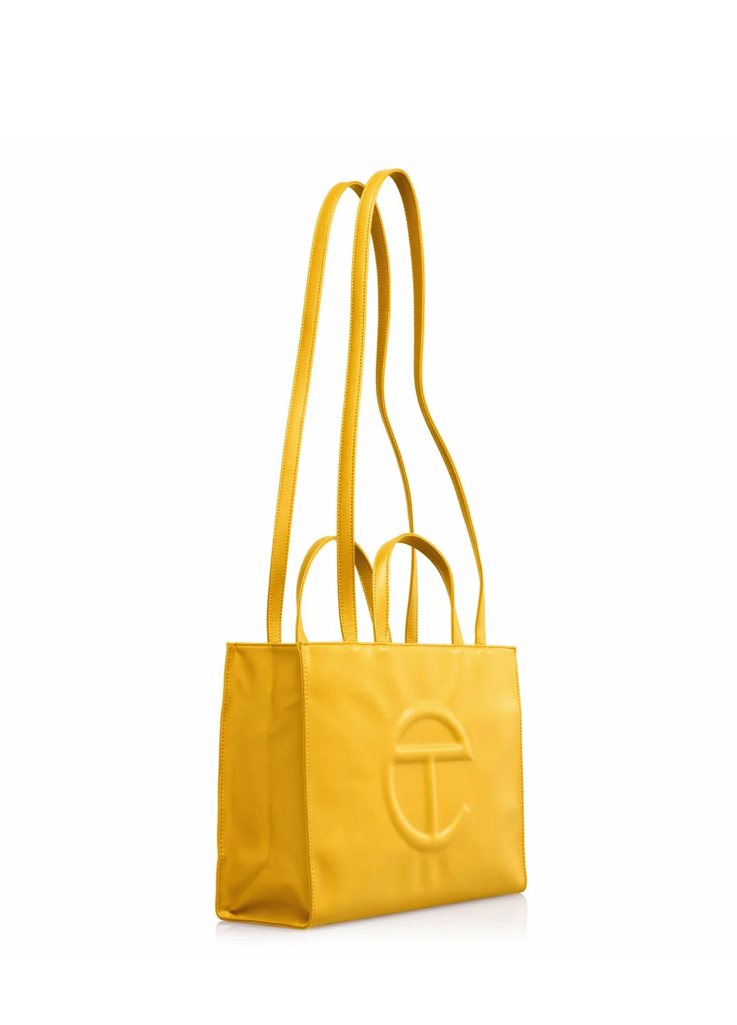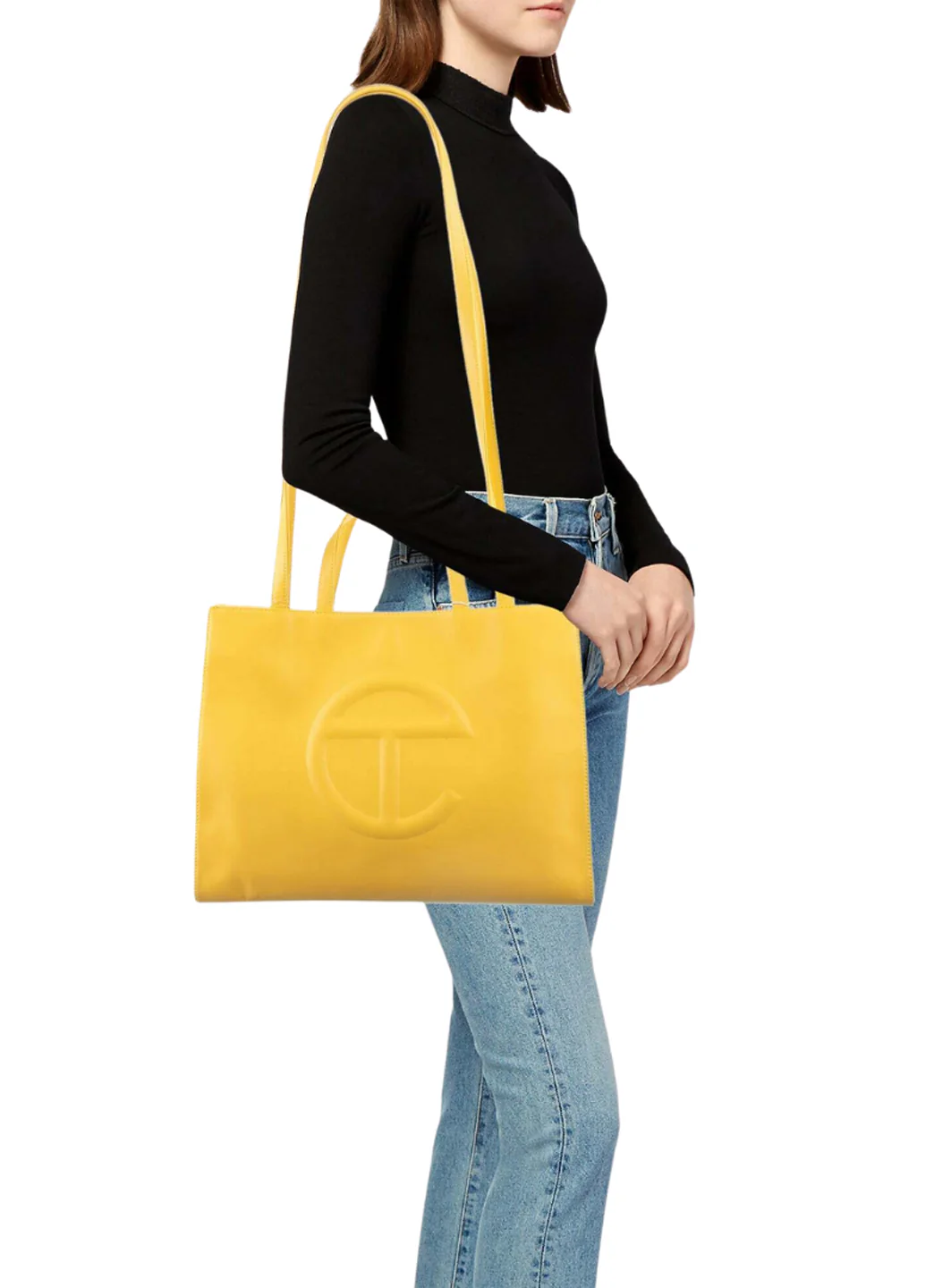 Культова сумка для покупок - практична сумка на кожен день. Вона має подвійні ремінці (ручки та ремінці через плече), тиснений логотип і магнітну застібку. Виготовлена зі штучної шкіри з підкладкою з твілу, сумка поставляється в мішечку зі шнурком з 100% бавовни із трафаретним логотипом.