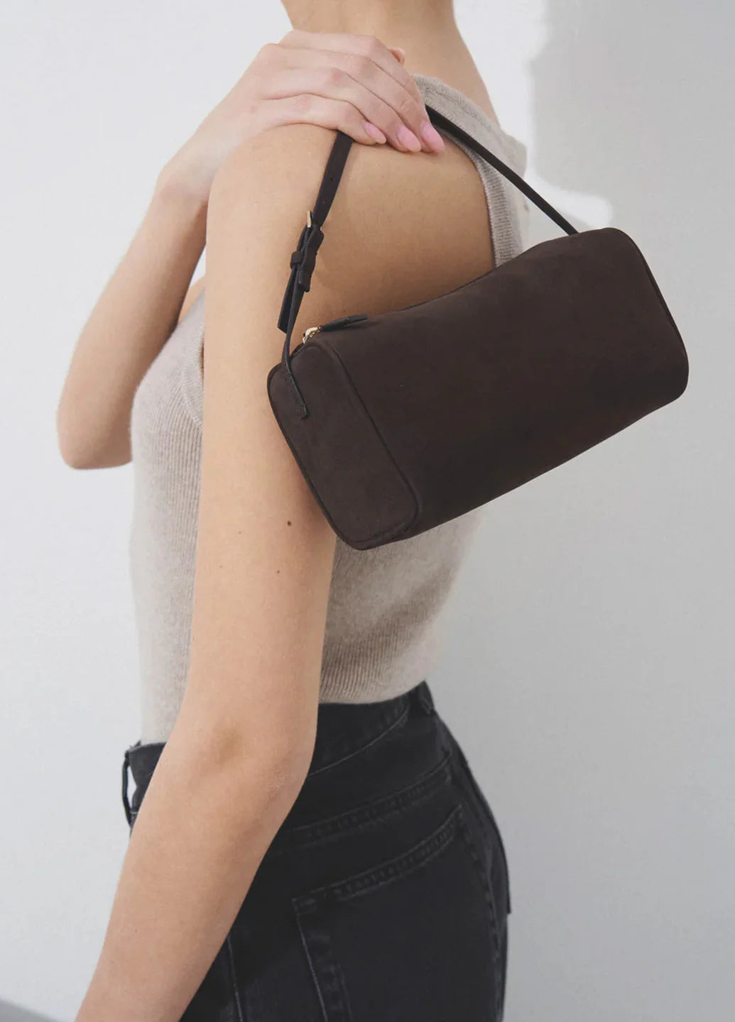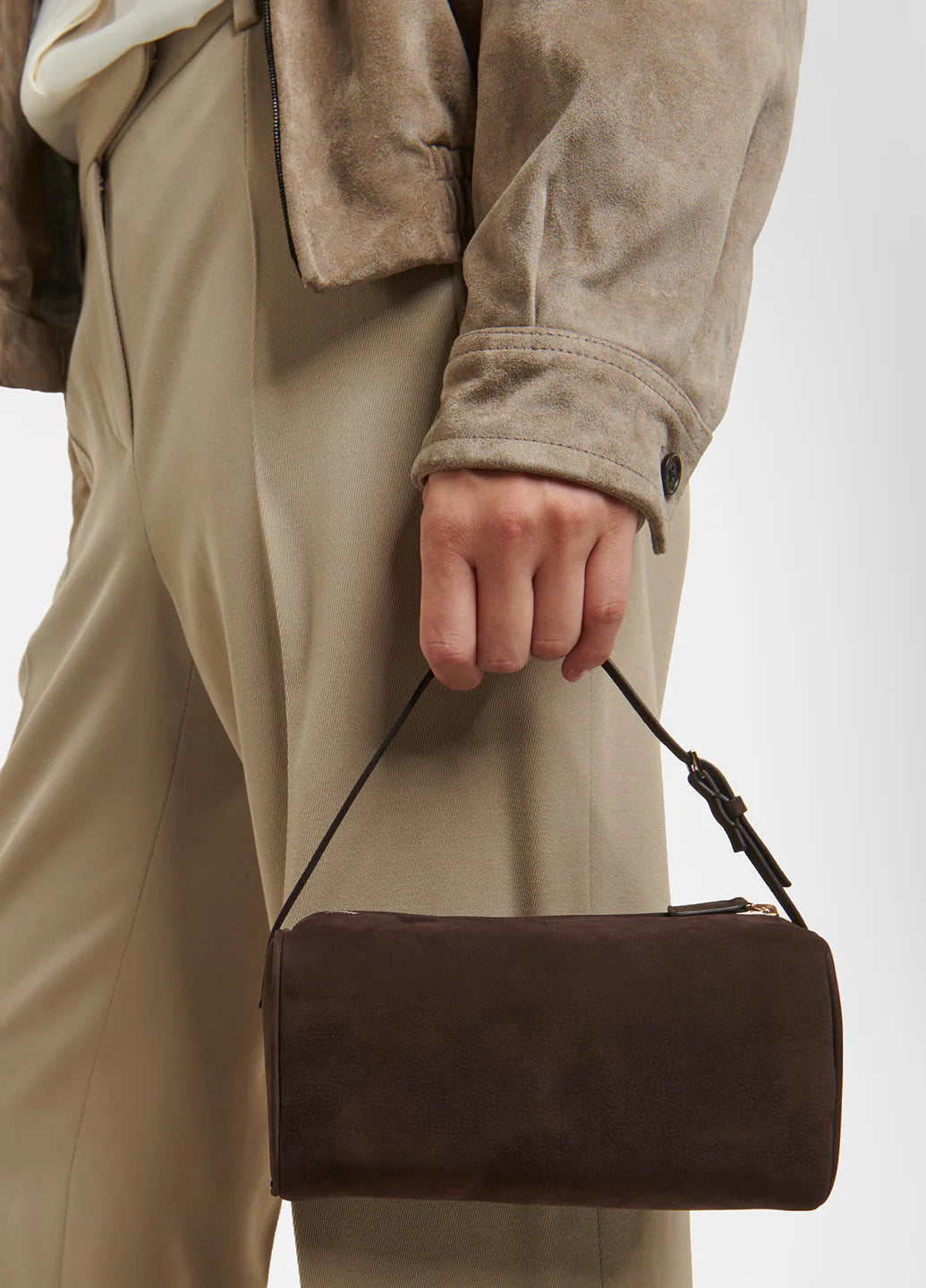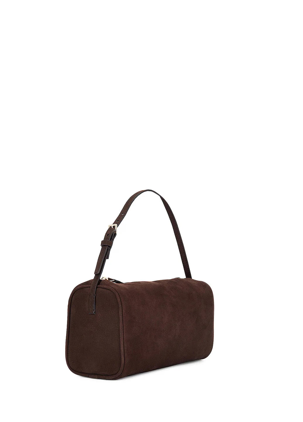 Сумка з дрібнозернистої натуральної шкіри має плавно закруглені краї, шкіряний кант і регульований тонкий шкіряний ремінець.
